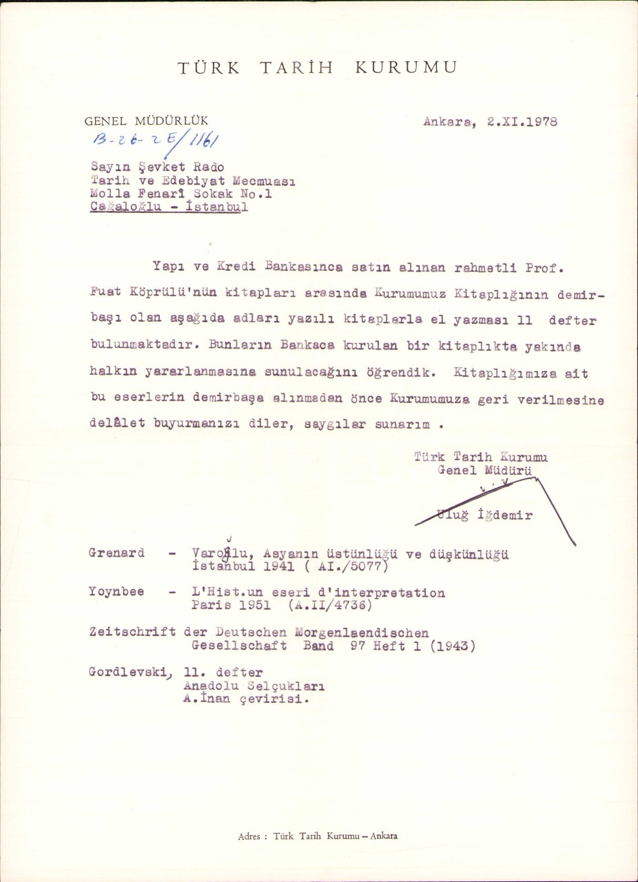 Mektup elyazması defterlerin Türk Tarih Kurumuna verilmesi hakkındadır. Ayrıca Şevket Rado'nun cevap mektubu içerisinde yer almaktadır. Cevap mektubu 23x29 cm, zarf 13x16 cm.