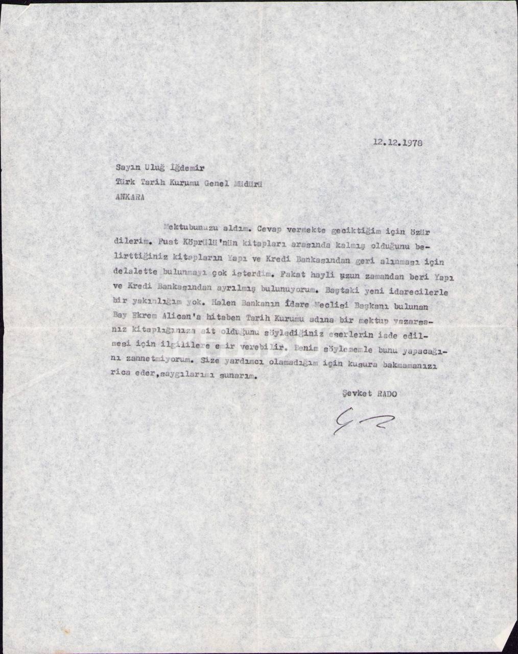 Türk Tarih Kurumu Genel Müdürü Uluğ İğdemir'den Şevket Rado'ya Yazılmış 1978 Yılına Ait Mektup ve Şevket Rado'nun imzalı cevap mektubu, zarfıyla birlikte, 21x19 cm