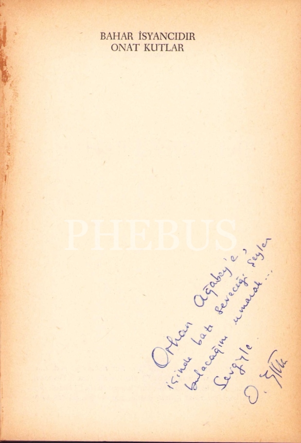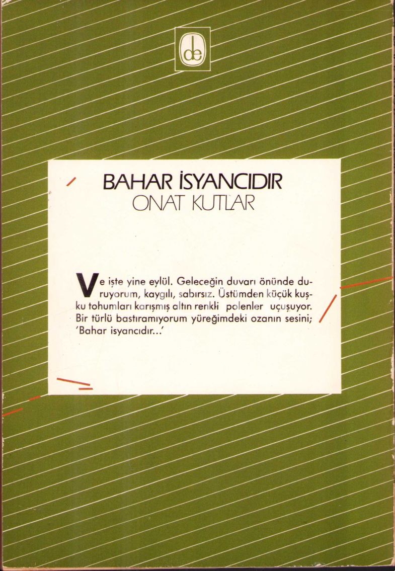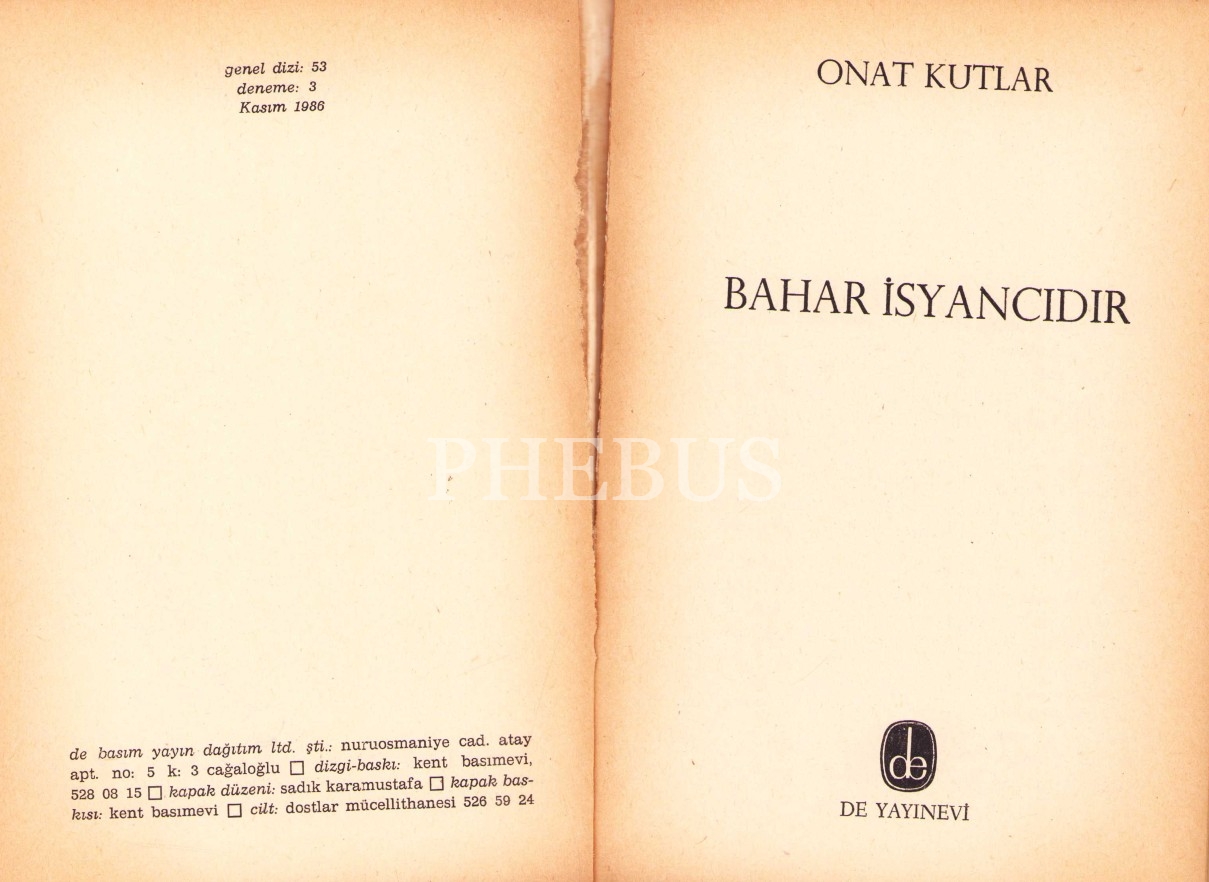 Onat Kutlar'ın İthaflı ve İmzalı "Bahar İsyancıdır -Deneme-" İlk Baskısı, De Yayınevi 1986, 84 sayfa, 13x19 cm