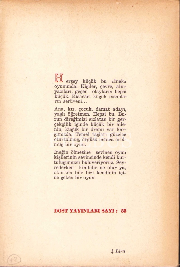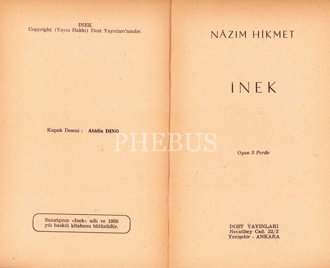 Nâzım Hikmet'in "İnek -Oyun-" Dost Yayınları 1965, 94 sayfa, 14x20 cm