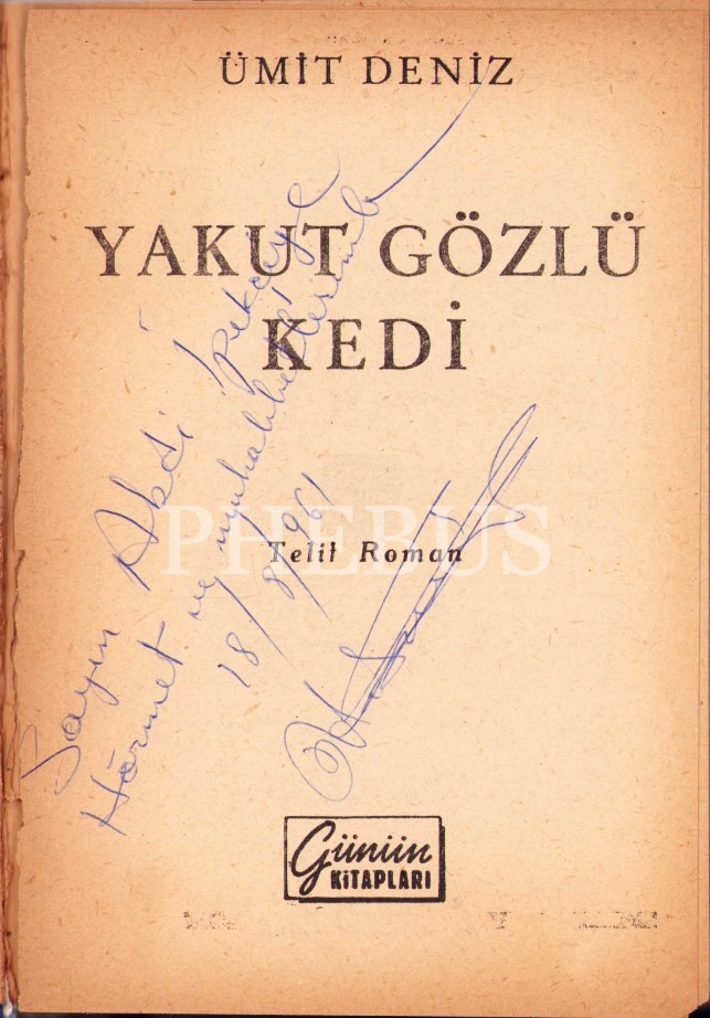 Ümit Deniz'den Abdi İpekçi'ye İthaflı ve İmzalı "Yakut Gözlü Kedi", Türkiye Yayınevi 1961, 280 sayfa, cilt görseli hafif yorgun haliyle, 14x20 cm