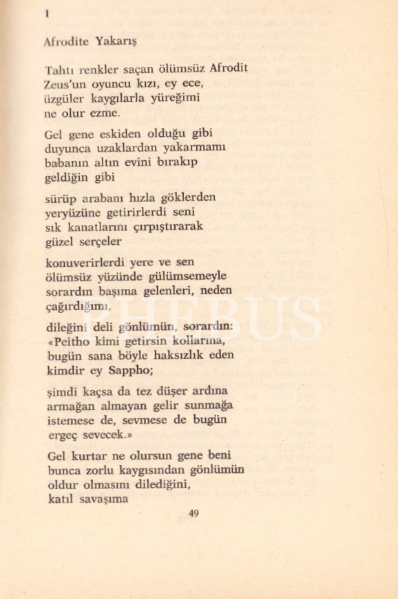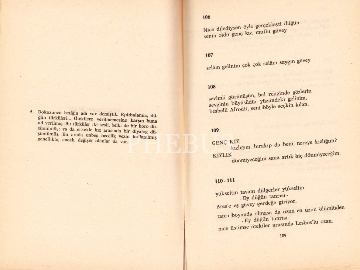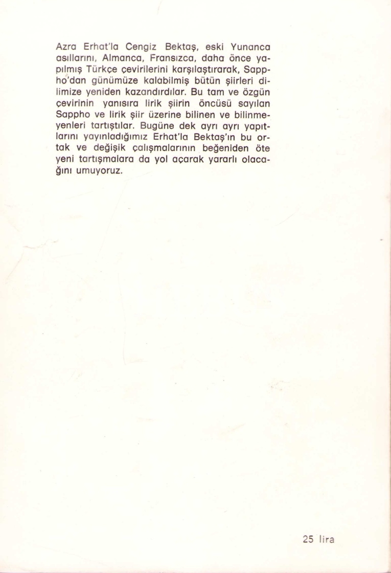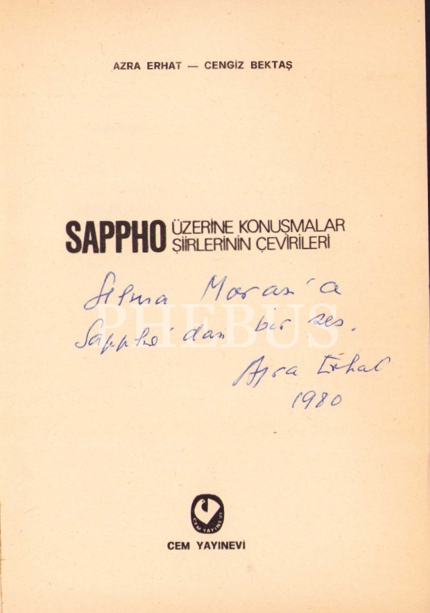 Azra Erhat'ın İthaflı ve İmzalı "Sappho Üzerine Konuşmalar Şiir Çevirileri", Hazırlayan Azra Erhat-Cengiz Bektaş, Cem Yayınevi 1978, 161 sayfa, 14x20 cm