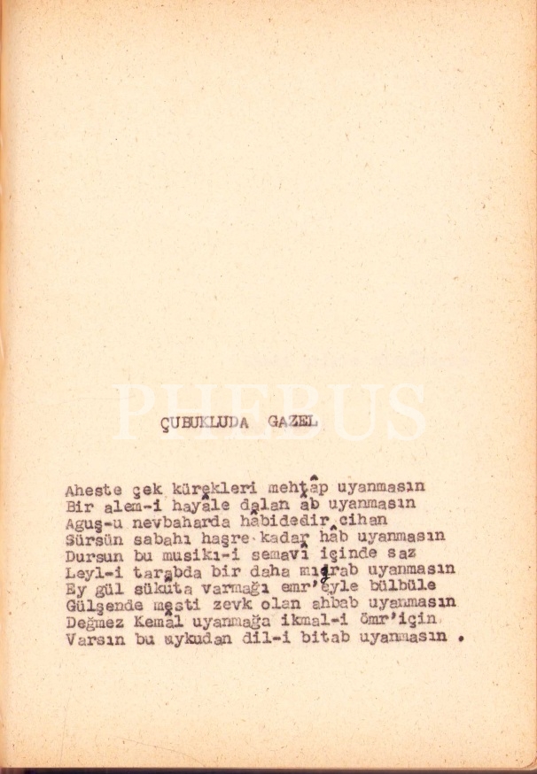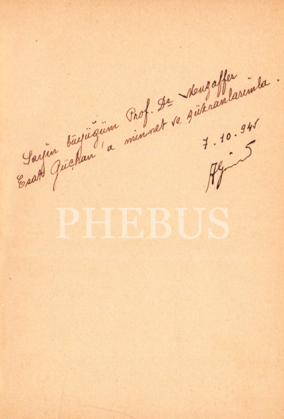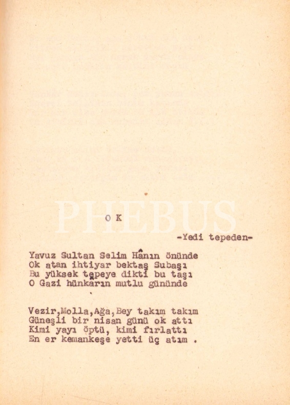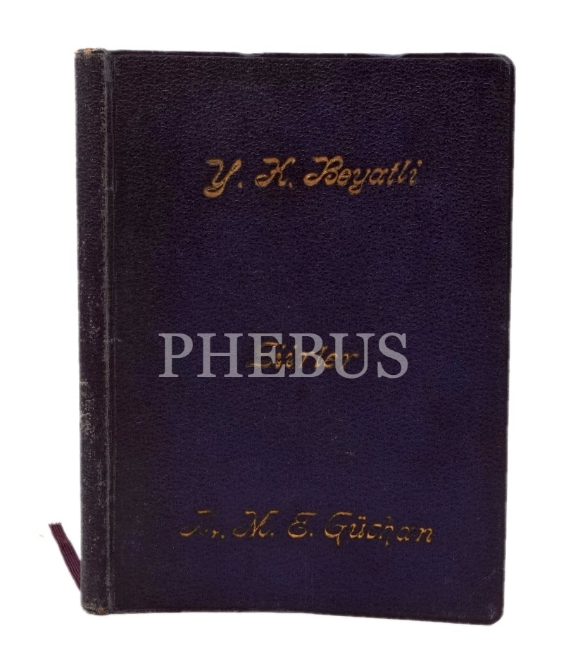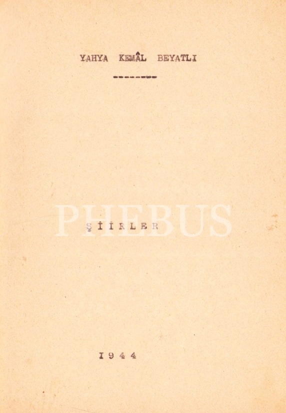 Yahya Kemal Beyatlı [Vefatı: 1958], hayatta iken kendi müsaadesiyle herhangi bir kitabı yayınlanmamıştır. Fakat şairin sevenlerinden bazıları Yahya Kemal'in şiirlerini bazen el yazılarıyla defterlerine kaydetmiş, bazen de daktilo metinler halinde derlemişlerdir. Müzayedemizin bu lotunda dikkatinize sunduğumuz daktilo şiirler derlemesi, bir kitap formunda hazırlanmış olup, şiirler konularına göre ayrılmıştır. Muhtelif şiirlerin üzerinde düzeltmeler de mevcuttur. 1944'te yapılan bu şiir derlemesi, Ekim 1945 tarihinde Yahya Kemal'in sohbet çevresinden olan Doktor Muzaffer Esat Güçhan'a imzalanmıştır. İthaf, "Sayın büyüğüm Prof. Dr. Muzaffer Esat Güçhan'a minnet ve şükranlarımla 7.10. 1945" şeklindedir. / İmza Yahya Kemal'e ait değildir.