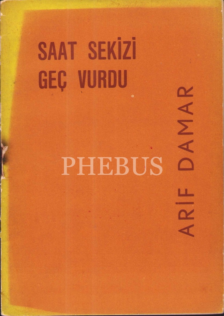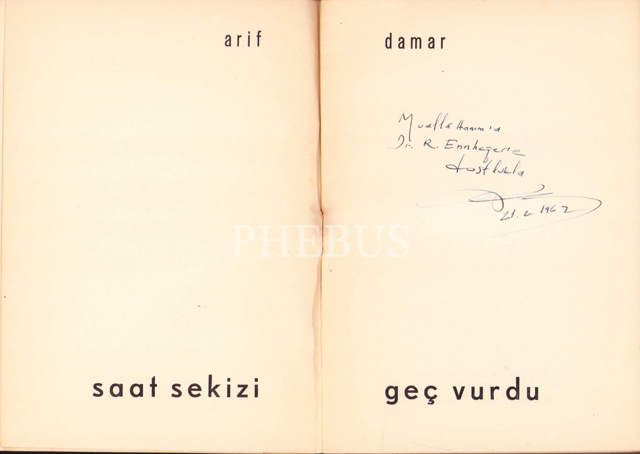 Şair Arif Damar'ın İthaflı ve İmzalı "Saat Sekizi Geç Vurdu" İlk Baskısı, İstanbul Matbaası 1962, 30 sayfa, kitap sırtı yorgun haliyle, 14x20 cm