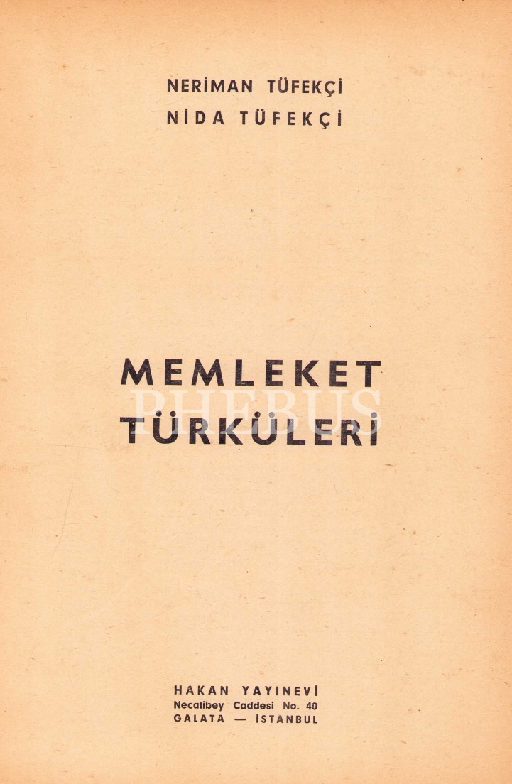 Neriman Tüfekçi ve Nida Tüfekçi'den İthaflı ve İmzalı "Memleket Türküleri", Hakan Yayınevi 1964, 145 sayfa, kitap sırtı hafif yıpranmış haliyle, 20x27 cm