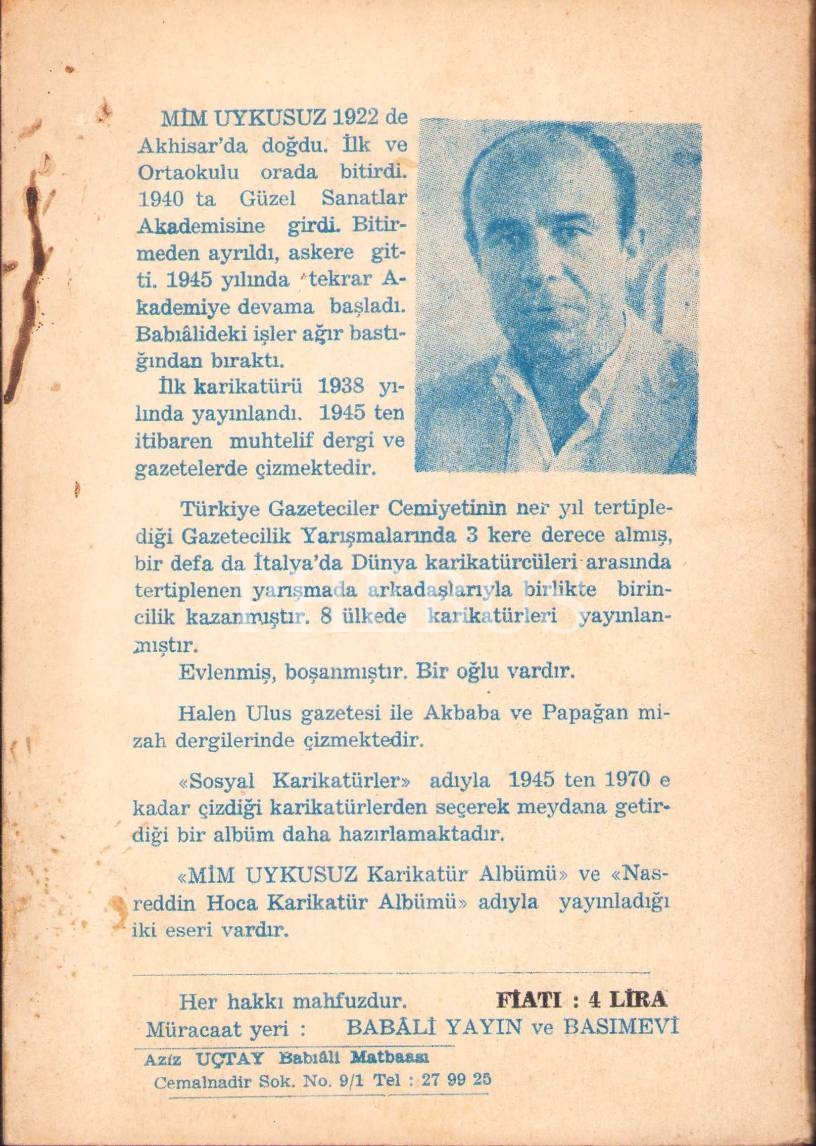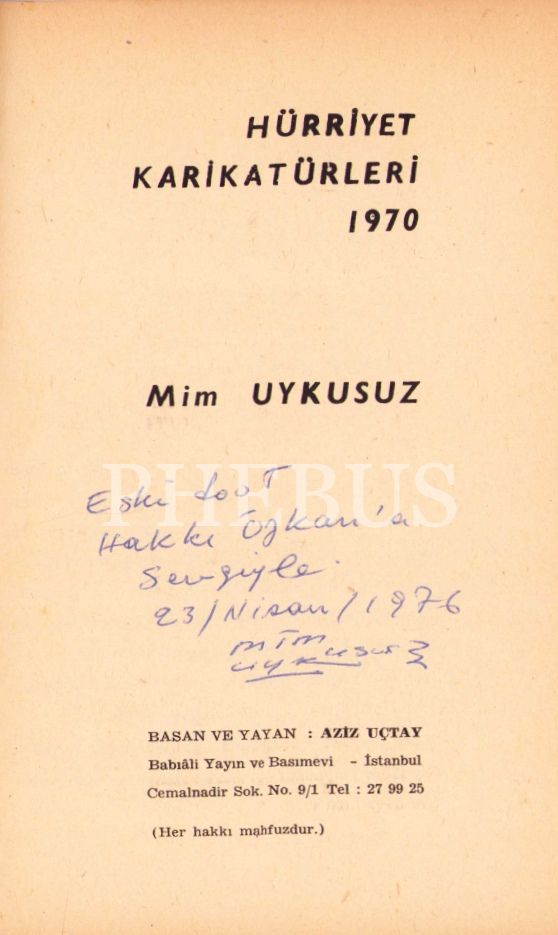 Mim Uykusuz'dan Yazar Hakkı Özkan'a İthaflı ve İmzalı "Hürriyet Karikatürleri", Babıâli Basın ve Yayınevi 1970, 56 sayfa, 14x20 cm