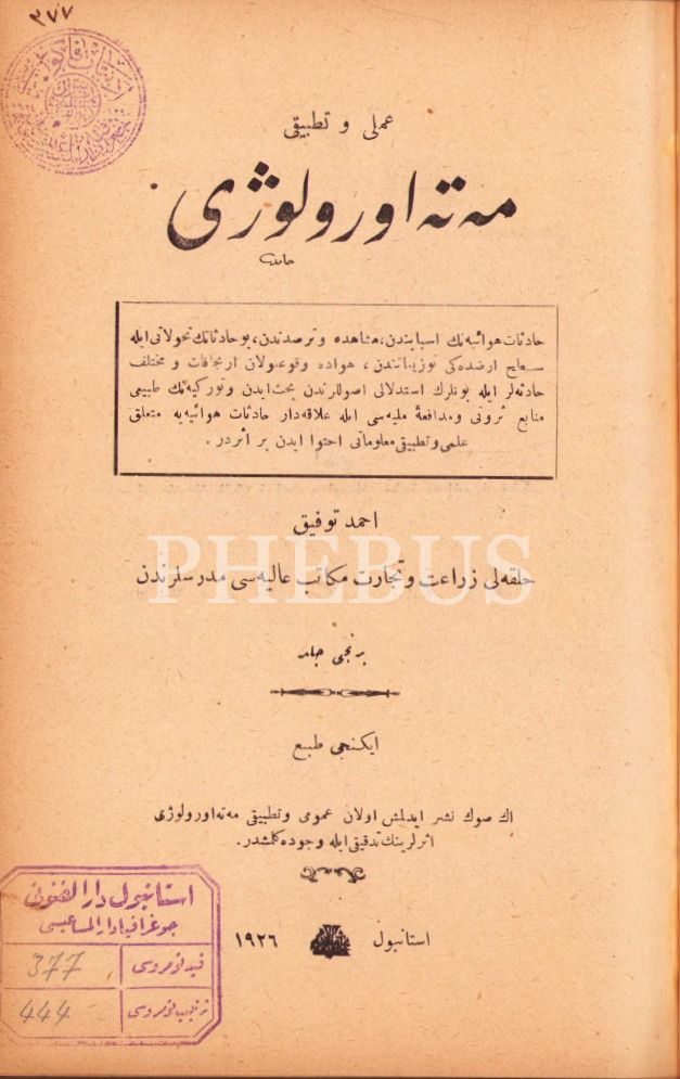 Osmanlıca Amelî ve Tatbîkî Meteoroloji [1. Cilt], Ahmed Tevfik, İstanbul 1926, 368 s., 16x23 cm, cildi soyulmuş haliyle
