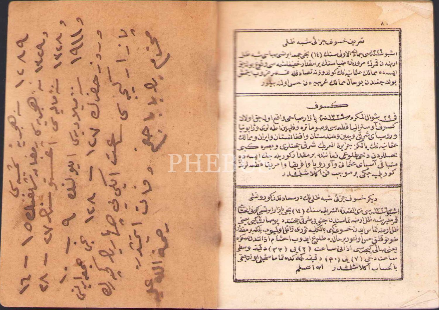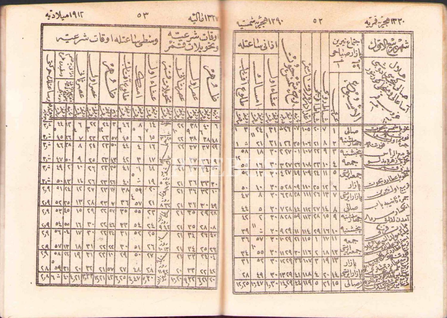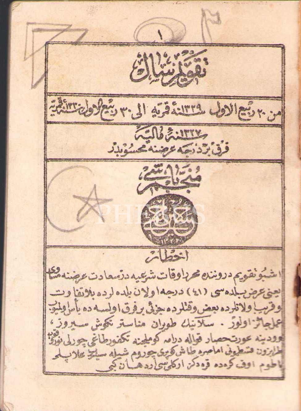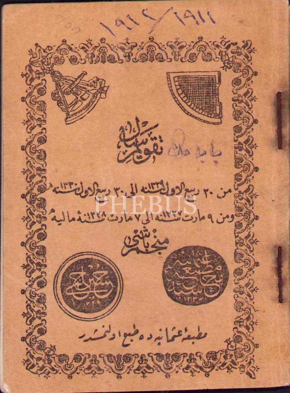 Osmanlıca Takvîm-i Sâl (1329-1330), Müneccimbaşı Hüseyin Hilmi, Osmaniye Matbaası, 80 s., 8x11 cm, su almış ve kapak sayfası hafif yıpranmış haliyle