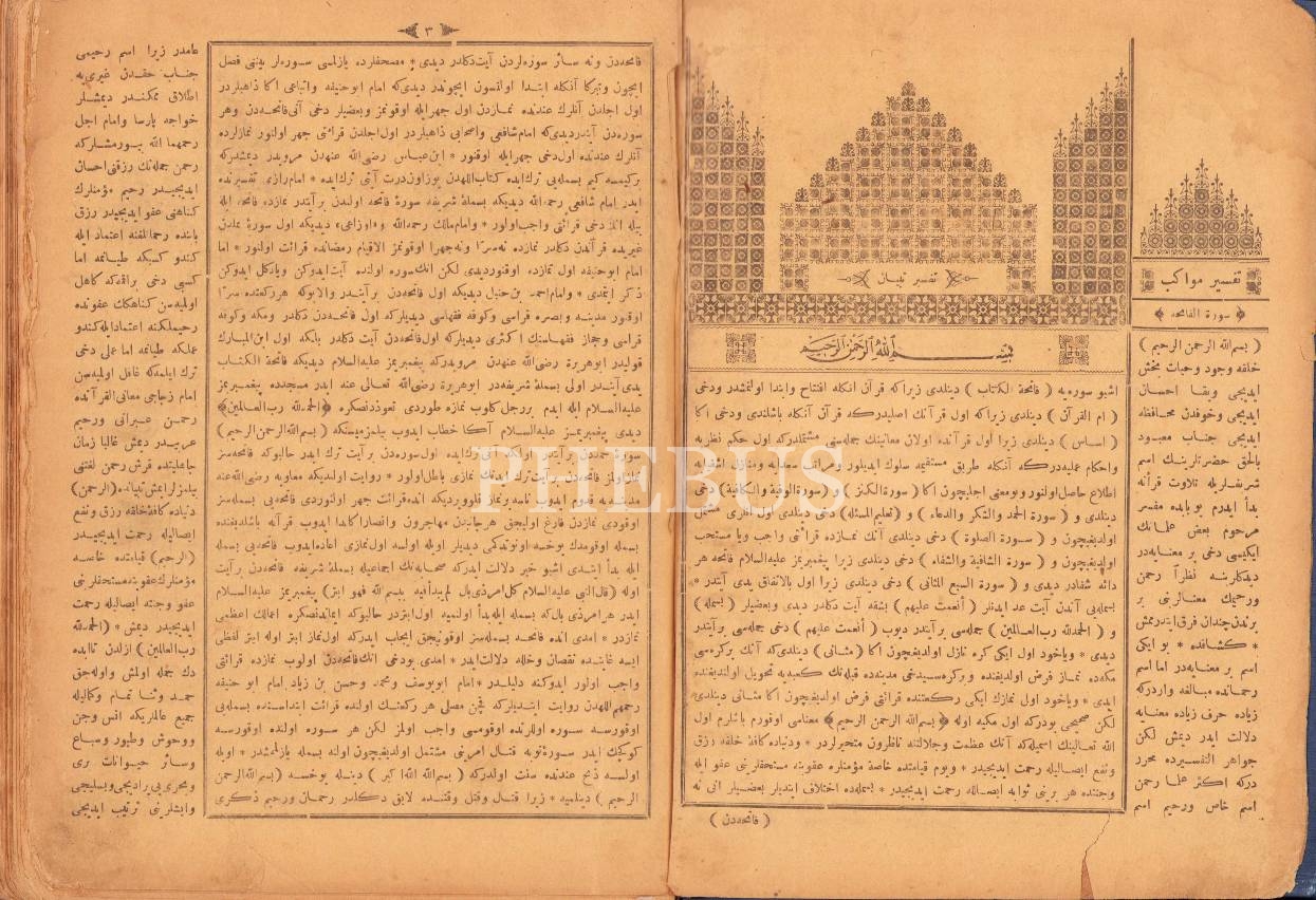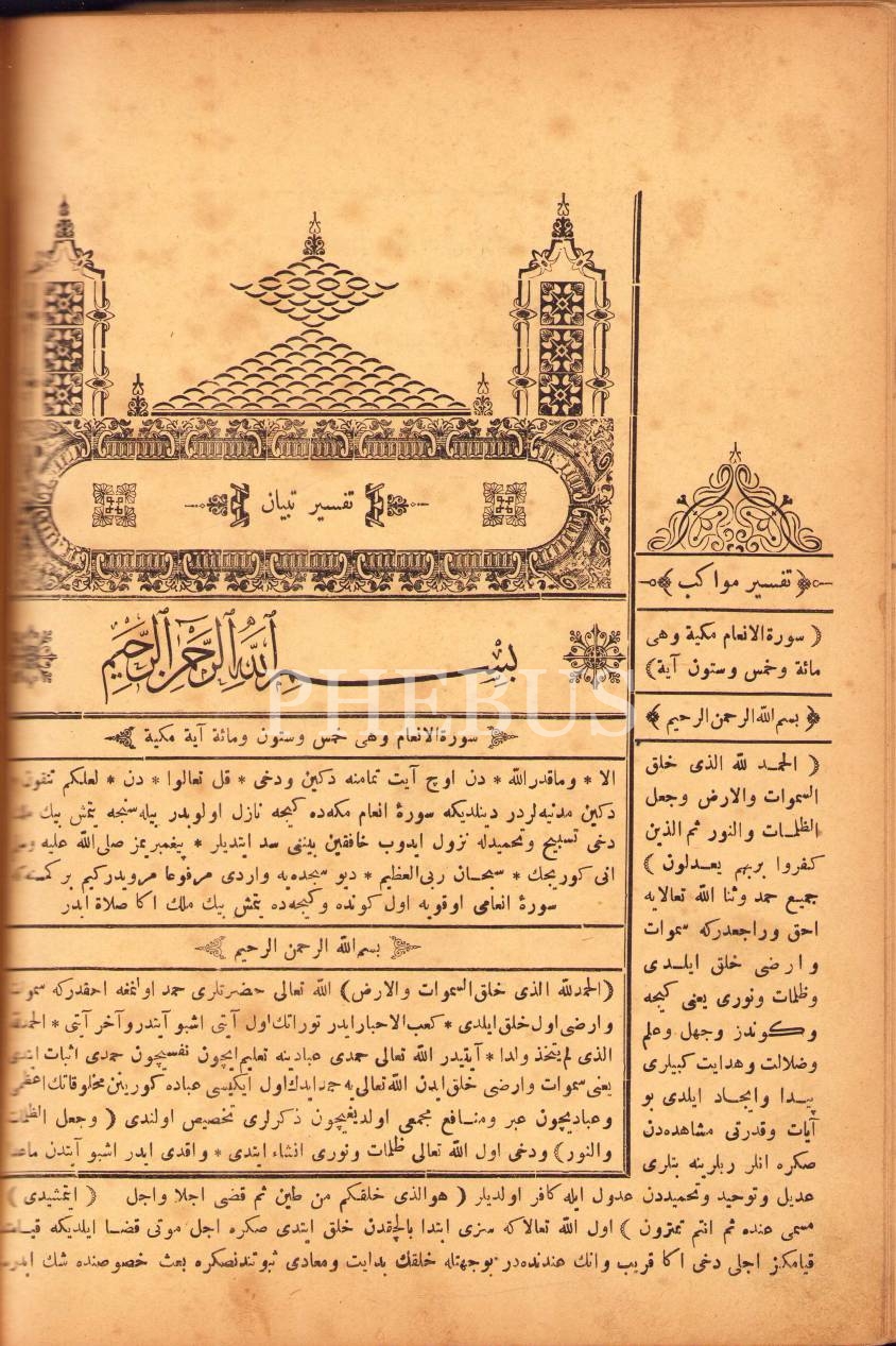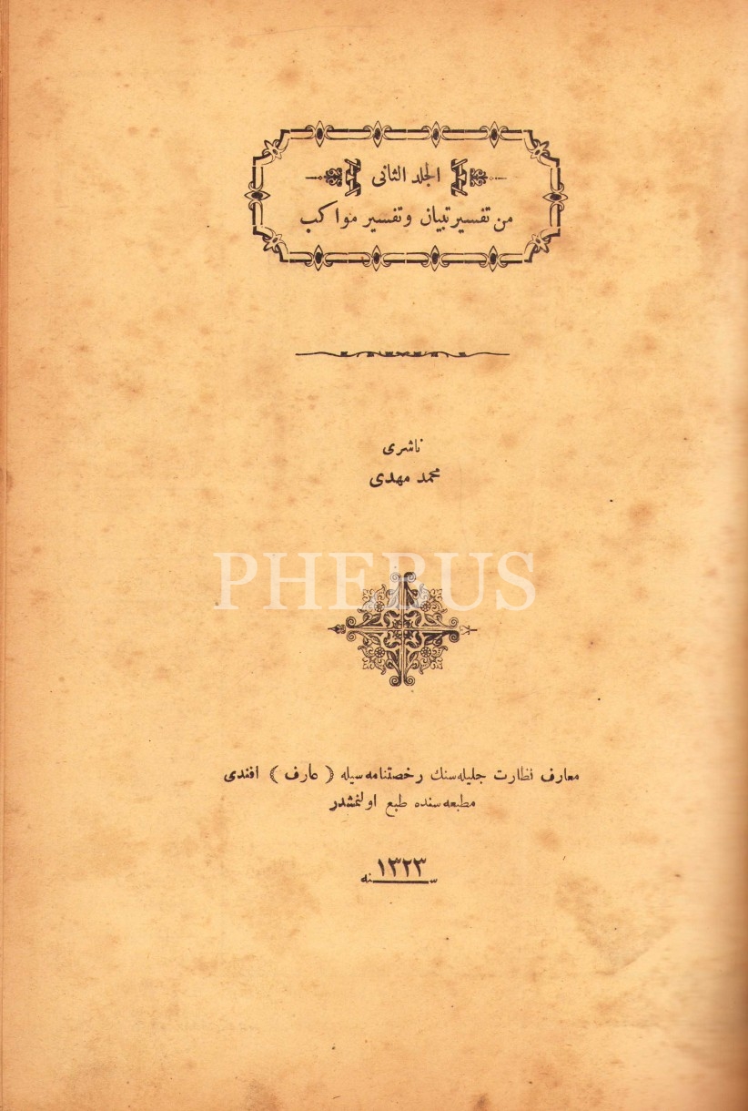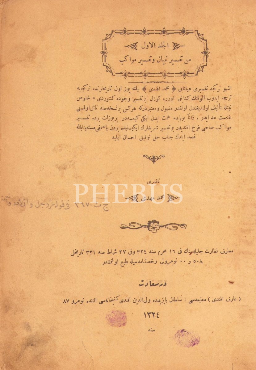 Osmanlıca Tefsîru Tibyân ve Tefsîru Mevâkib [2 cilt], Arif Efendi Matbaası, Dersaadet [İstanbul] 1323-24, 368+356 s., 20x27 cm, sayfa kenarları hafif yıpranmış haliyle