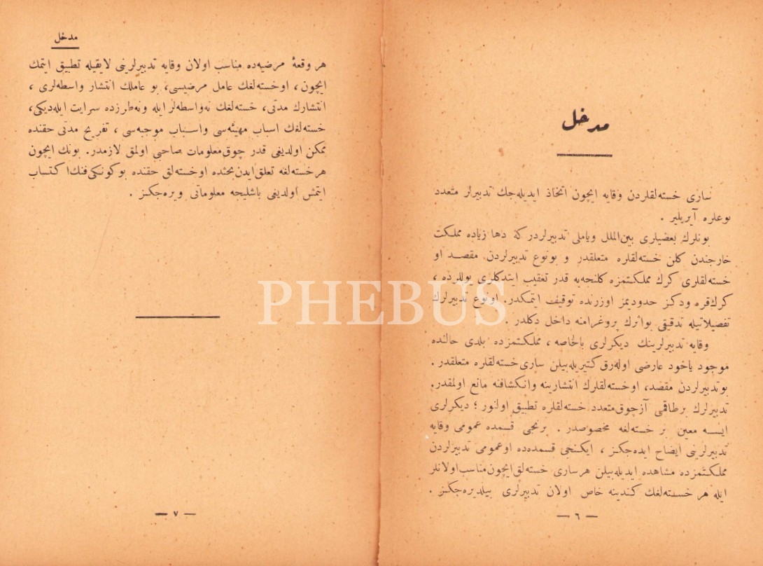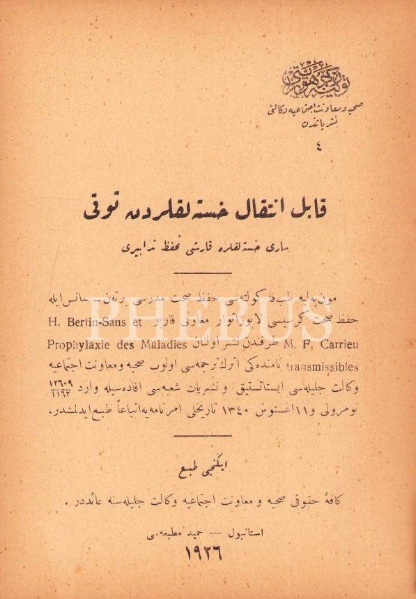 Osmanlıca Kâbil-i İntikâl Hastalıklardan Tevakkî [Bulaşıcı Hastalıklardan Korunma], Hamid Matbaası, İstanbul 1926, 329 s., 14x19 cm, ilk sayfası ayrık haliyle
