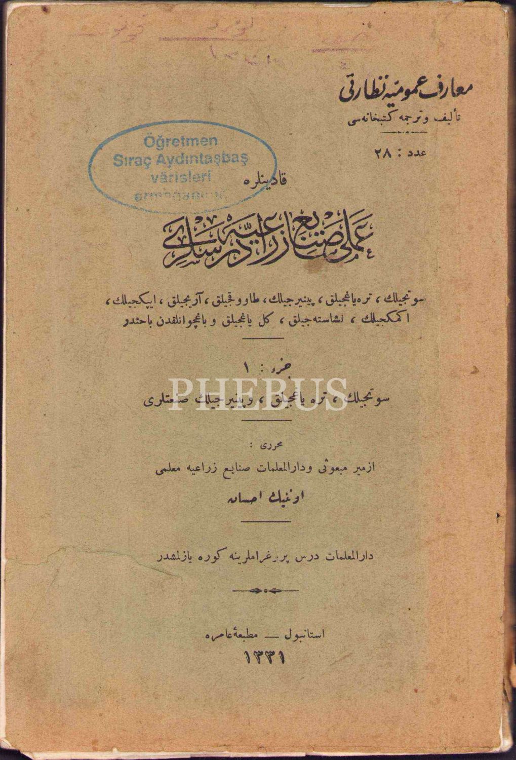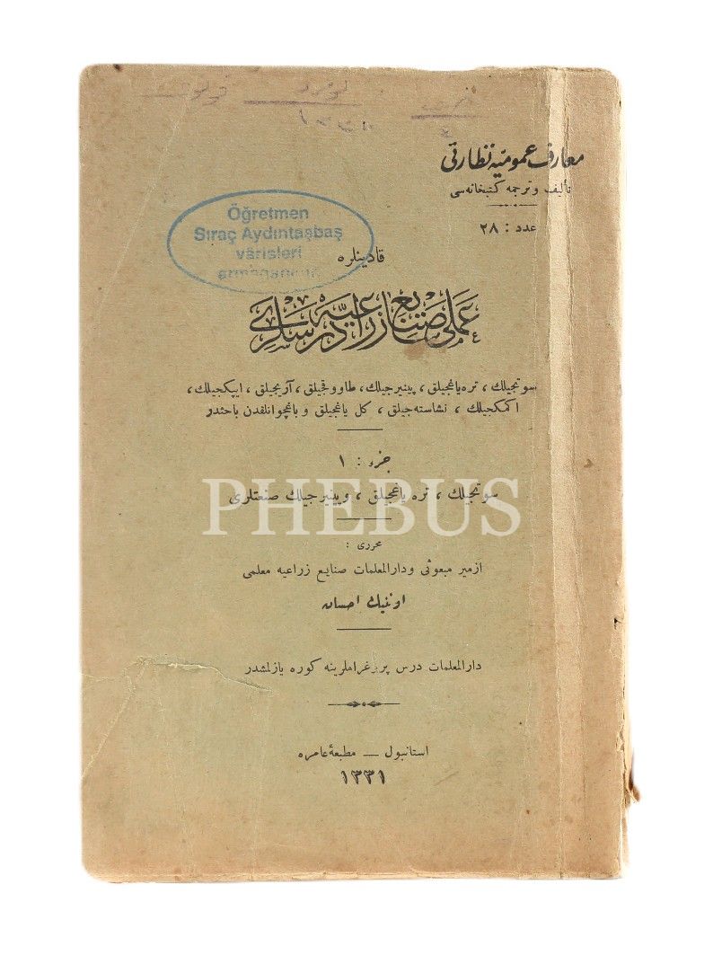 Osmanlıca Kadınlara Amelî Sanâyi-i Zirâiyye Dersleri-1. Kısım: Sütçülük, Tereyağcılık, Peynircilik Sanatları, Onnik İhsan, Amire Matbaası, İstanbul 1331, 153 s., 13x20 cm, arka kapağı kopuk ve ön kapağı yıpranmış haliyle