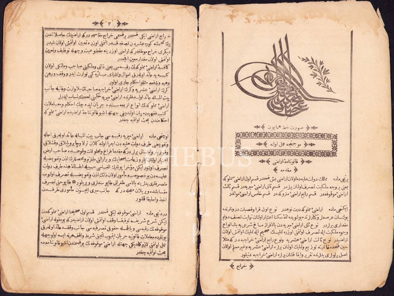 Osmanlıca Sûret-i Hatt-ı Hümâyûn-Kânûnnâme-i Arâzî, Takvimhane-i Amire, 1274, 38 s., 16x24 cm, kapağı epey yıpranmış haliyle