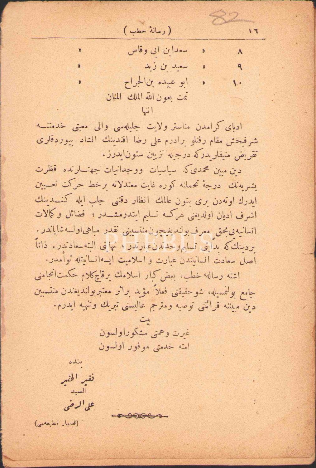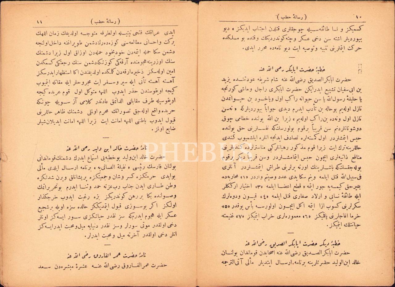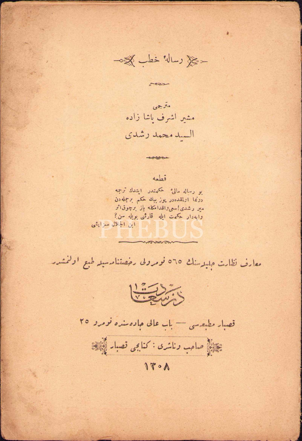 Osmanlıca Risâle-i Hutab, çev. Eşref Paşazade Seyyid Mehmed Rüşdi, Kasbar Matbaası, Dersaadet [İstanbul] 1308, 16 s., 13x19 cm, ciltsiz ve hafif yıpranmış haliyle