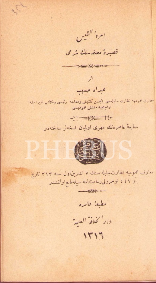 İmruülkays'ın Kasîde-i Muallaka'sının Osmanlıca Şerhi, Abdullah Hasib, Amire Matbaası, İstanbul 1316, 123 s., 12x18 cm