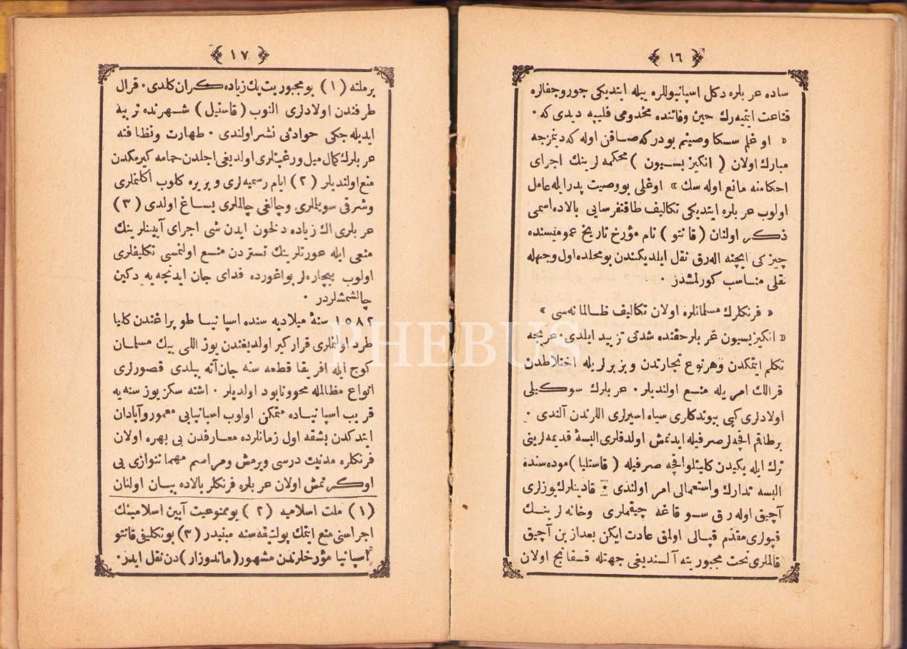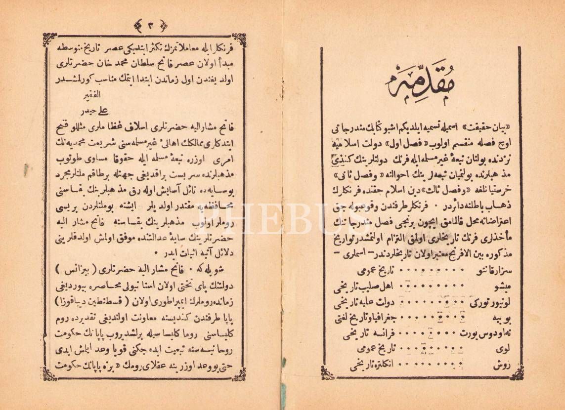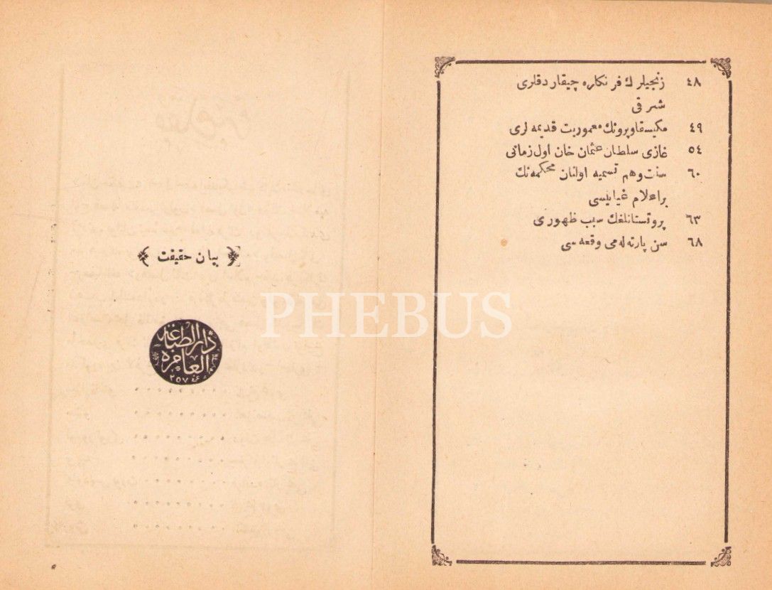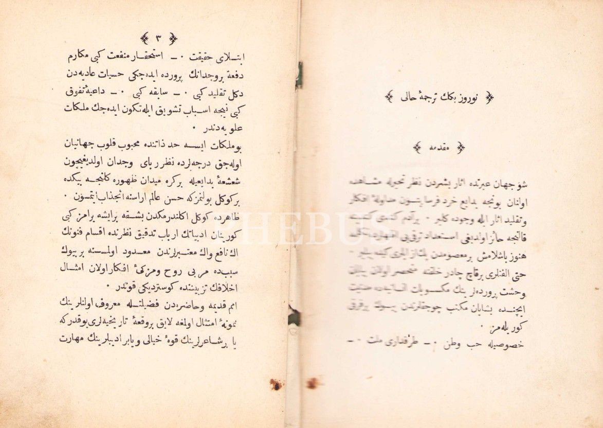 Osmanlıca 2 kitap tek ciltte: Tercüme-i Hâl-i Nevruz Bey [Biyografi], N. K., La Türki [La Turquie] ve Şark Matbaası, İstanbul 1292, 86 s.; Beyân-ı Hakîkat, Ali Haydar, Amire Matbaası, 1293, 70 s., 13x19 cm, sırtı ayrık ve yıpranmış haliyle