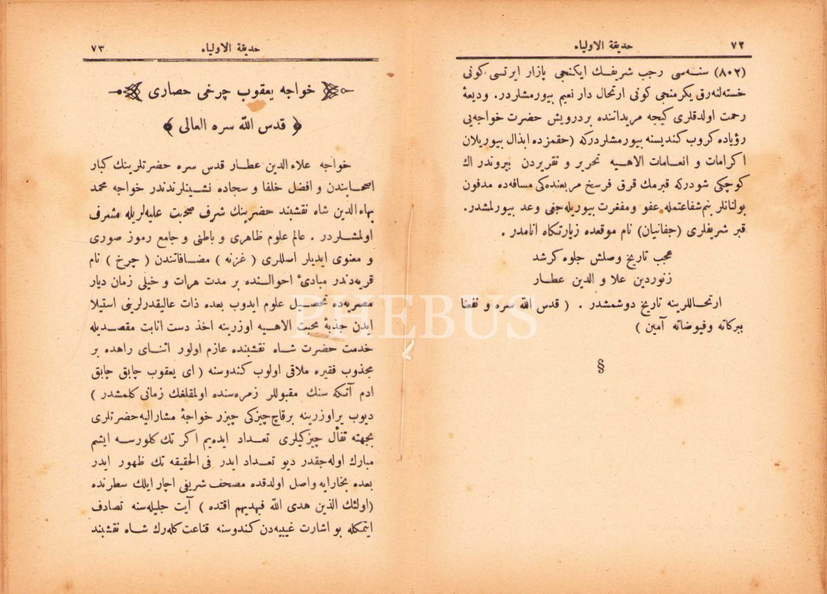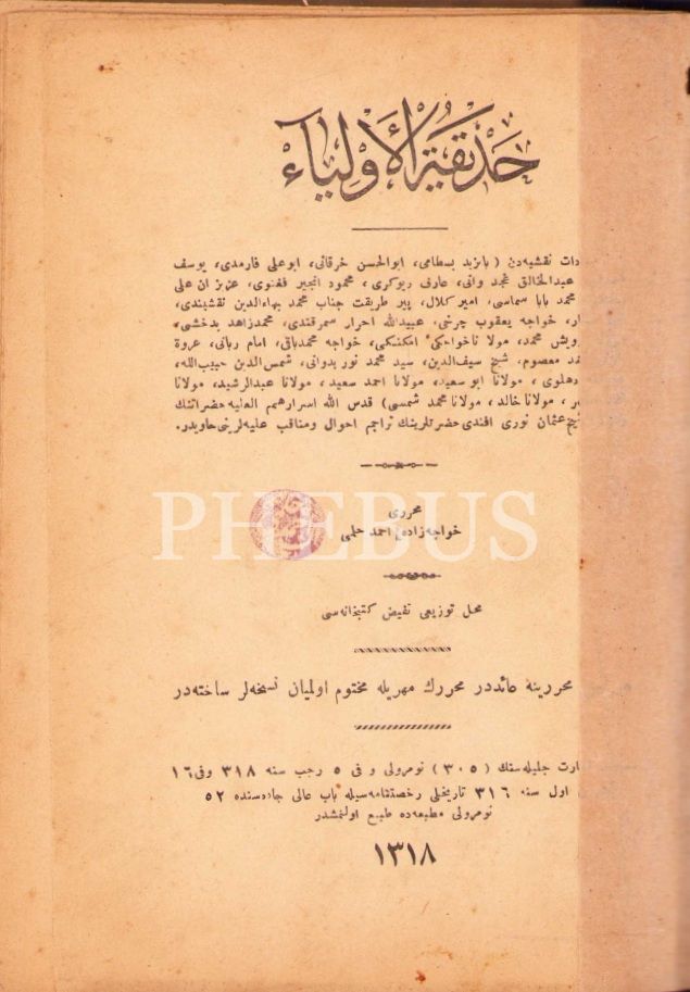 Osmanlıca Hadîkatü'l-Evliyâ, Hocazâde Ahmed Hilmi, İstanbul 1318, 175 s., 13x19 cm, sırtı ayrık ve cildi hafif yıpranmış haliyle