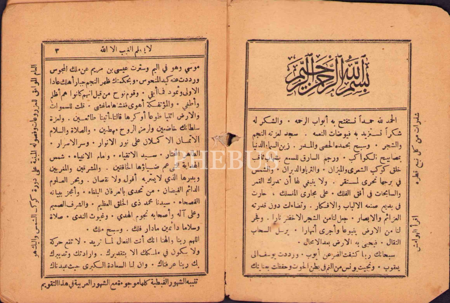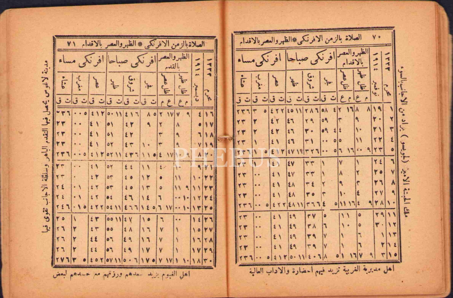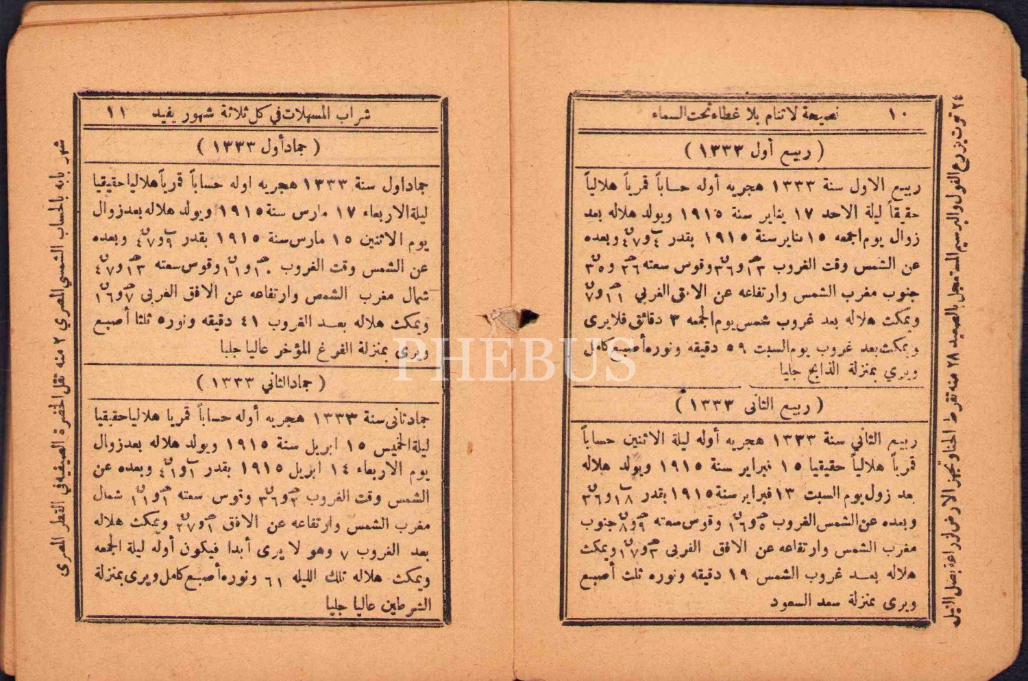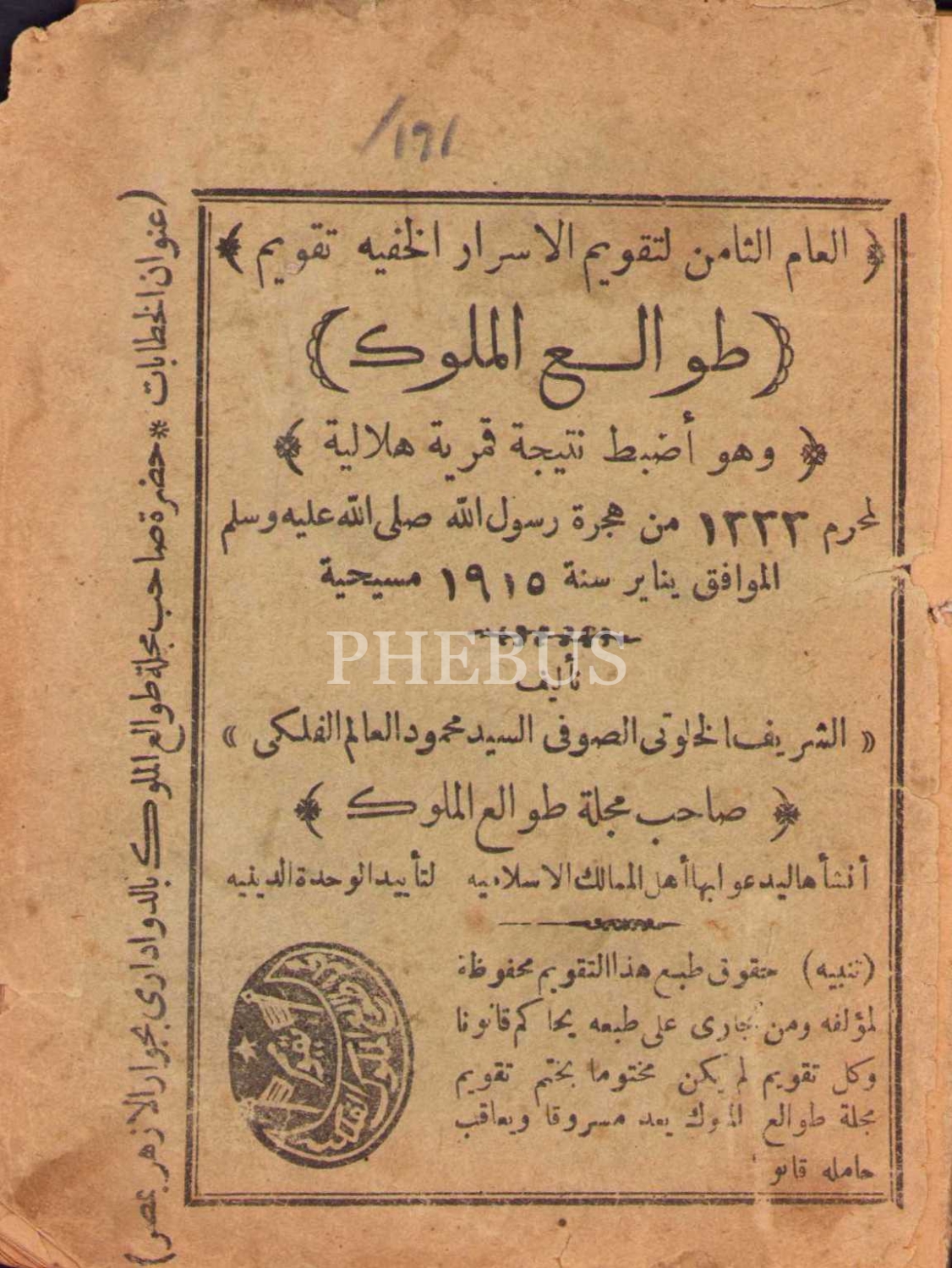 Arapça Tavâliu'l-Mülûk Takvimi (H. 1333-M. 1915 senesi), Seyyid Mahmud el-Alim el-Felekî, 10x13 cm, kapağı yıpranmış ve ön kapağı ayrık haliyle
