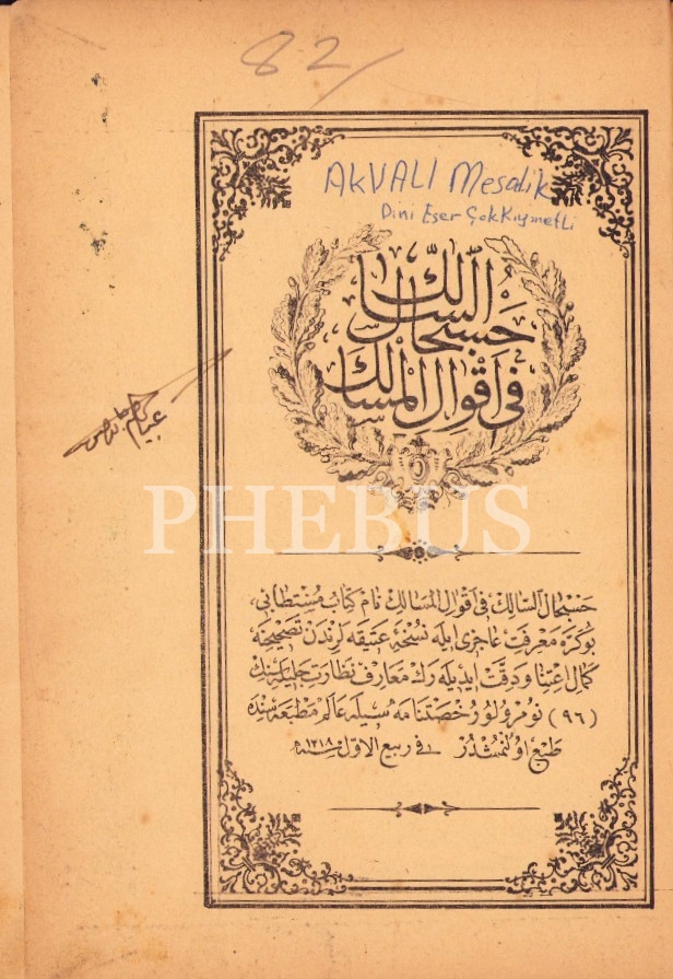 Osmanlıca Hasbihâlü's-Sâlik fî Akvâli'l-Mesâlik, Âlem Matbaası, 1318, 64 s., 16x23 cm, sırtı ayrık ve kapağı hafif yıpranmış haliyle