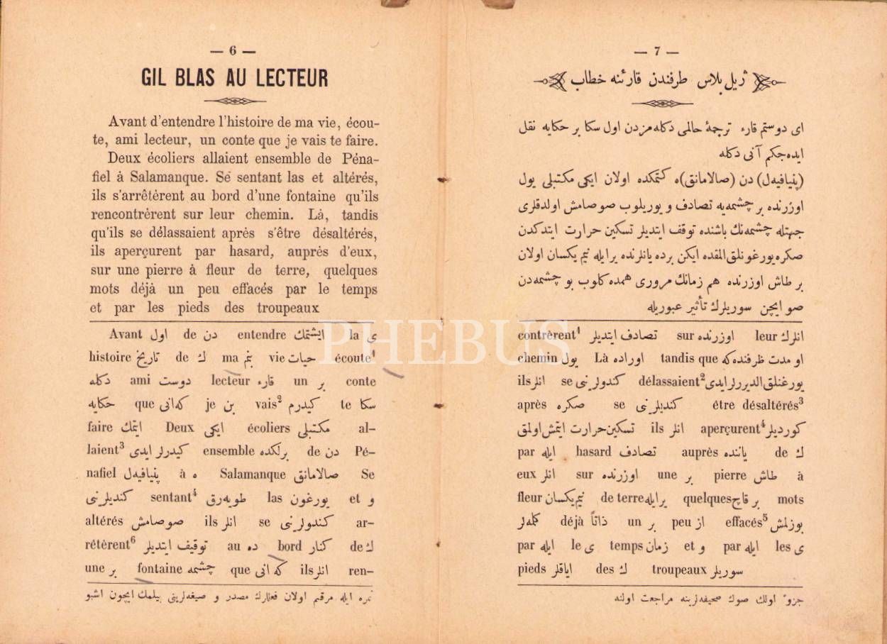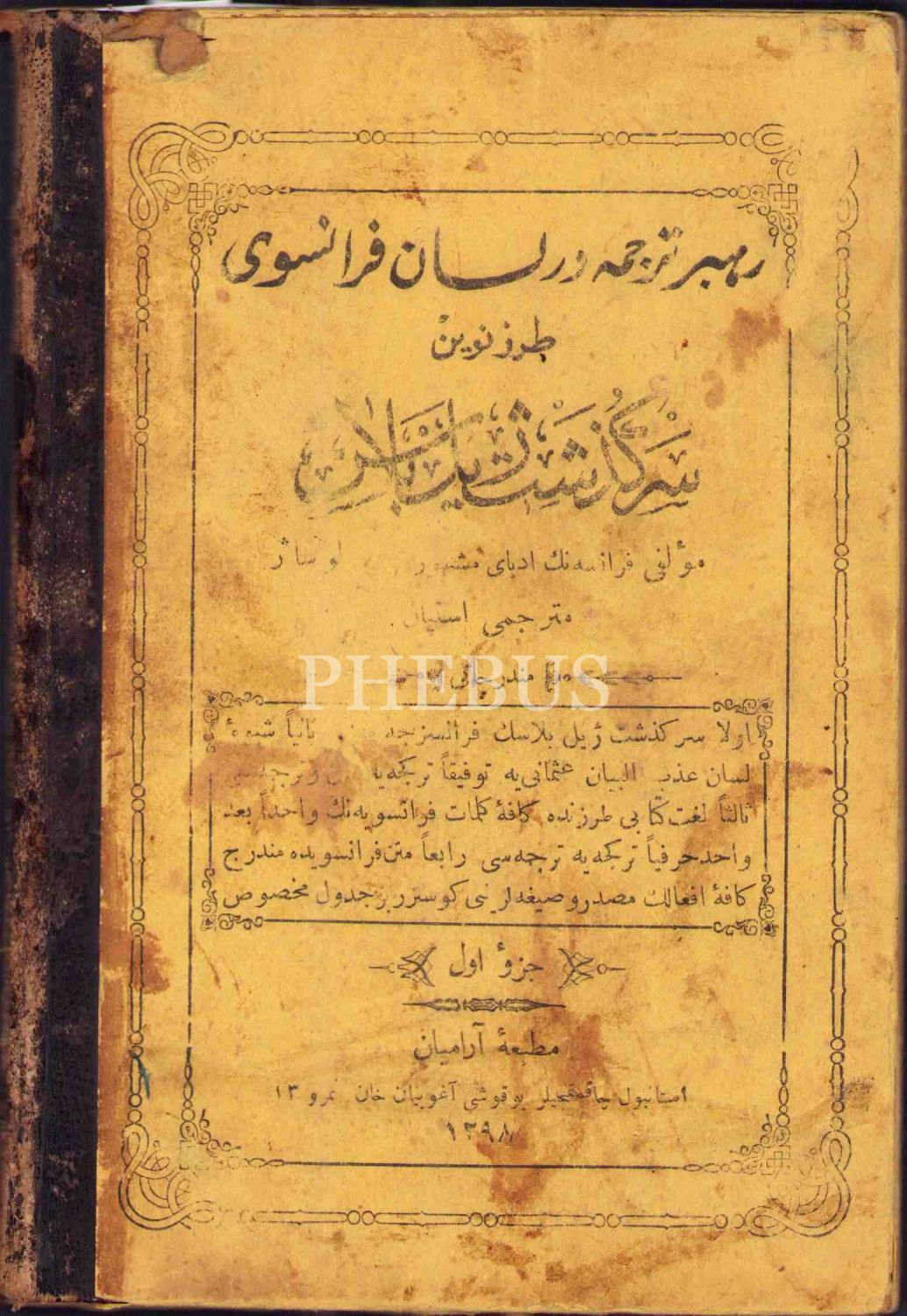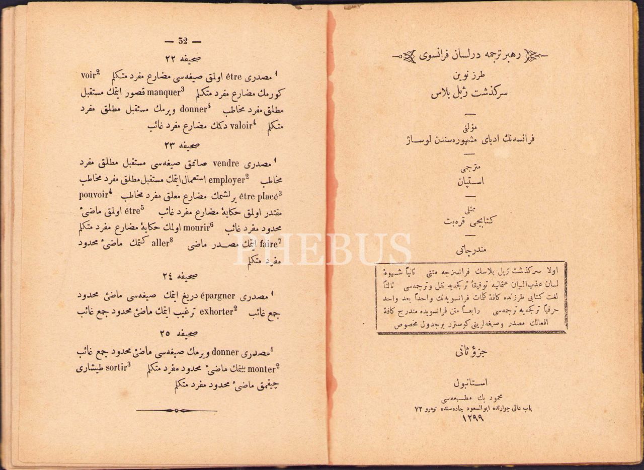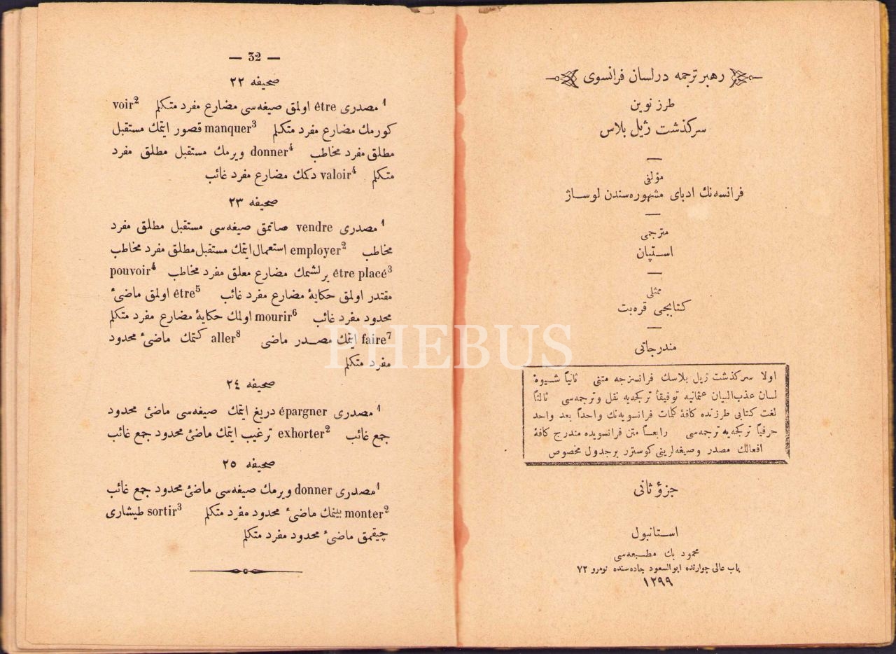 Osmanlıca-Fransızca Rehber-i Tercüme der Lisân-ı Fransevî-2 Kısım, Le Sage, çev. İstepan, Aramiyan ve Mahmud Bey Matbaaları, İstanbul 1298-99, 58 s., 13x19 cm, cildi yıpranmış haliyle