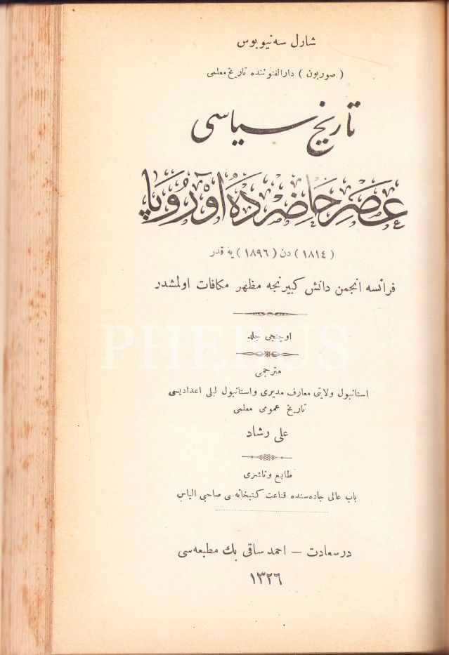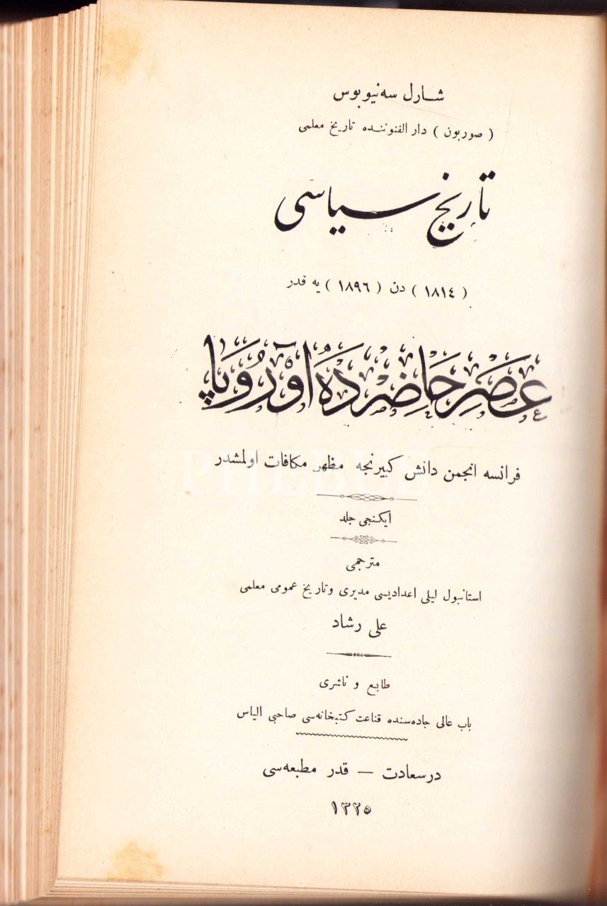 Osmanlıca Târîh-i Siyâsî - Asr-ı Hâzırda Avrupa (1814'den 1896'ya Kadar)-3 Cilt, Charles Seignobos, çev. Ali Reşad, Kader Matbaası, Dersaadet [İstanbul] 1324-25, 421+469+256 s., 17x24 cm, cildi hafif yıpranmış haliyle