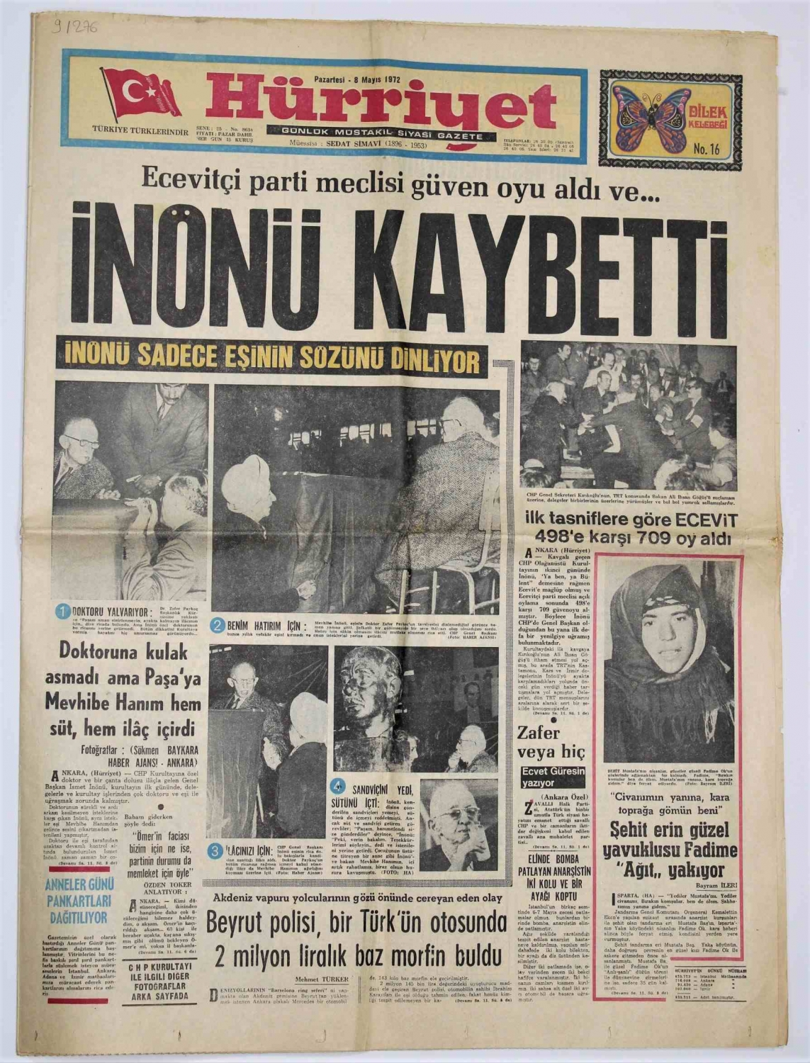"İNÖNÜ KAYBETTİ" manşetli 8 Mayıs 1972 tarihli Hürriyet gazetesi