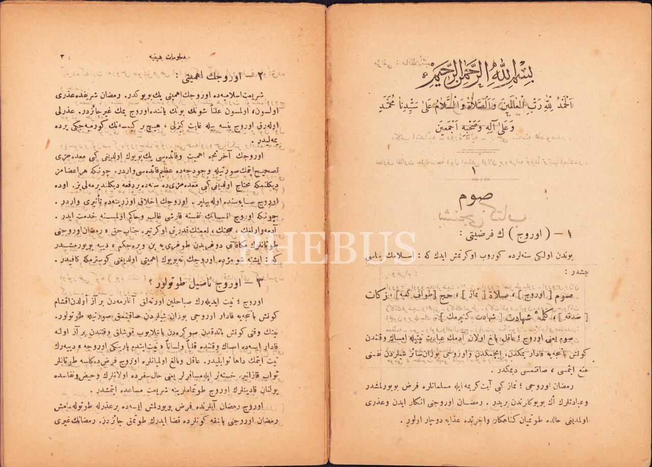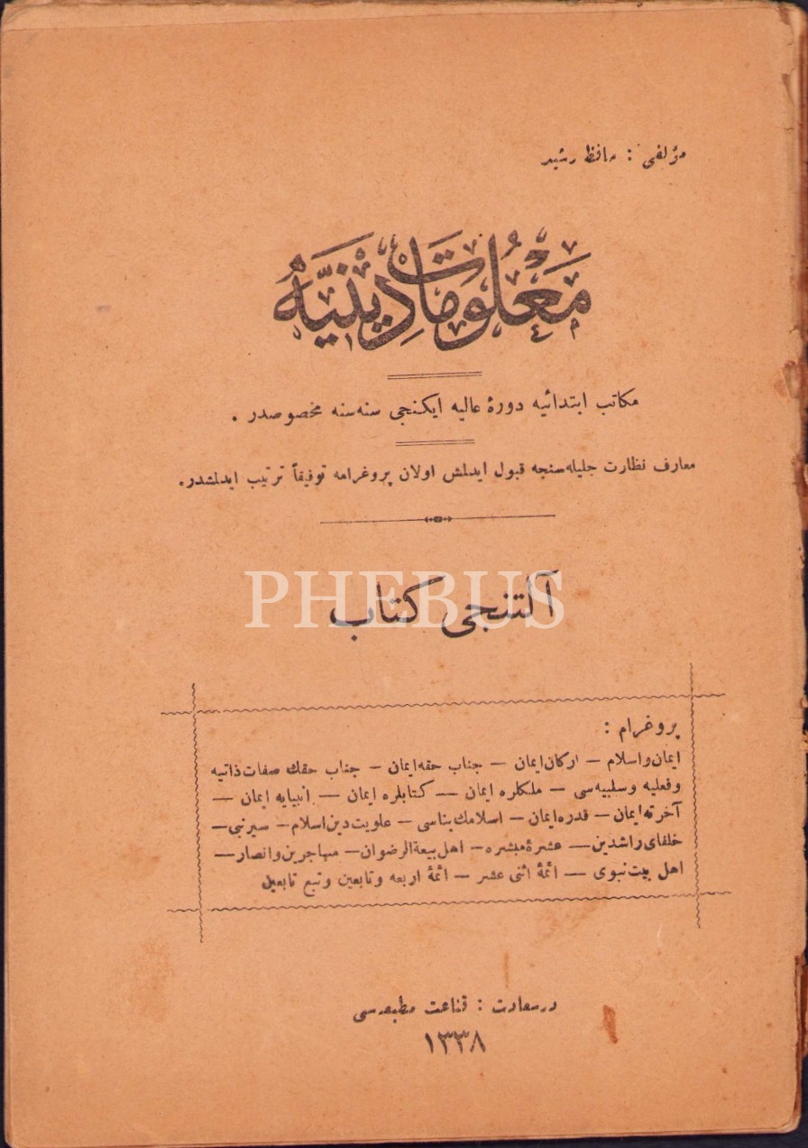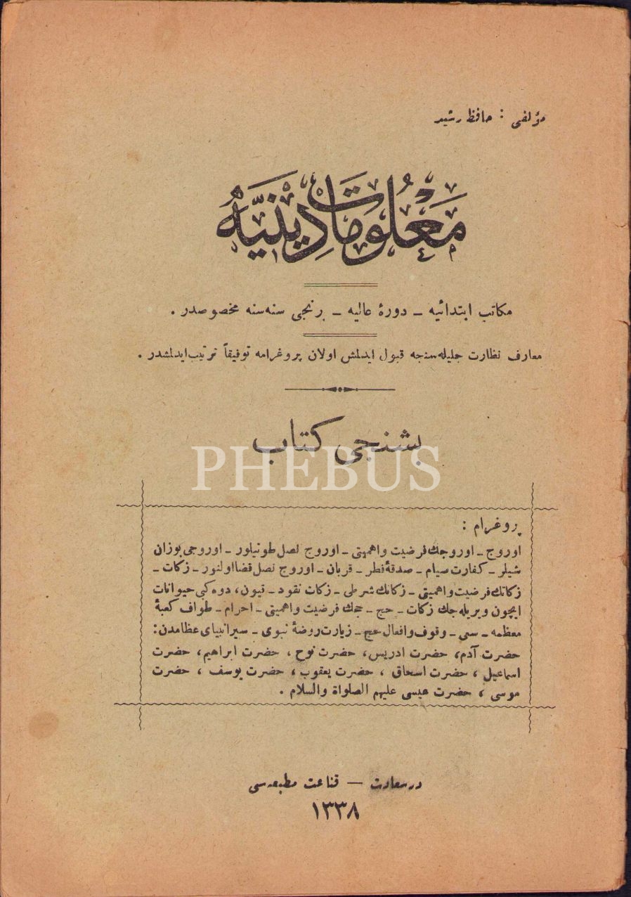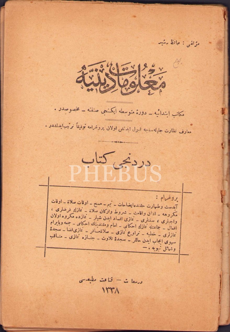 Osmanlıca Ma'lûmât-ı Dîniyye [Dinî Bilgiler] (4, 5 ve 6. Kitâb), Hafız Reşid, Kanaat Matbaası, Dersaadet [İstanbul] 1338, 39+38+56 s., 15x22 cm, kapak sayfaları yıpranmış haliyle