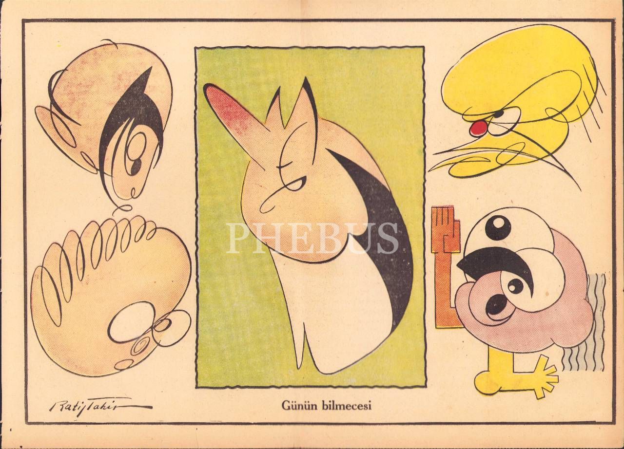 Karikatürist Ratip Tahir [Burak] imzalı "Günün Bilmecesi" karikatürü, 30x40 cm, kenarları yırtık haliyle