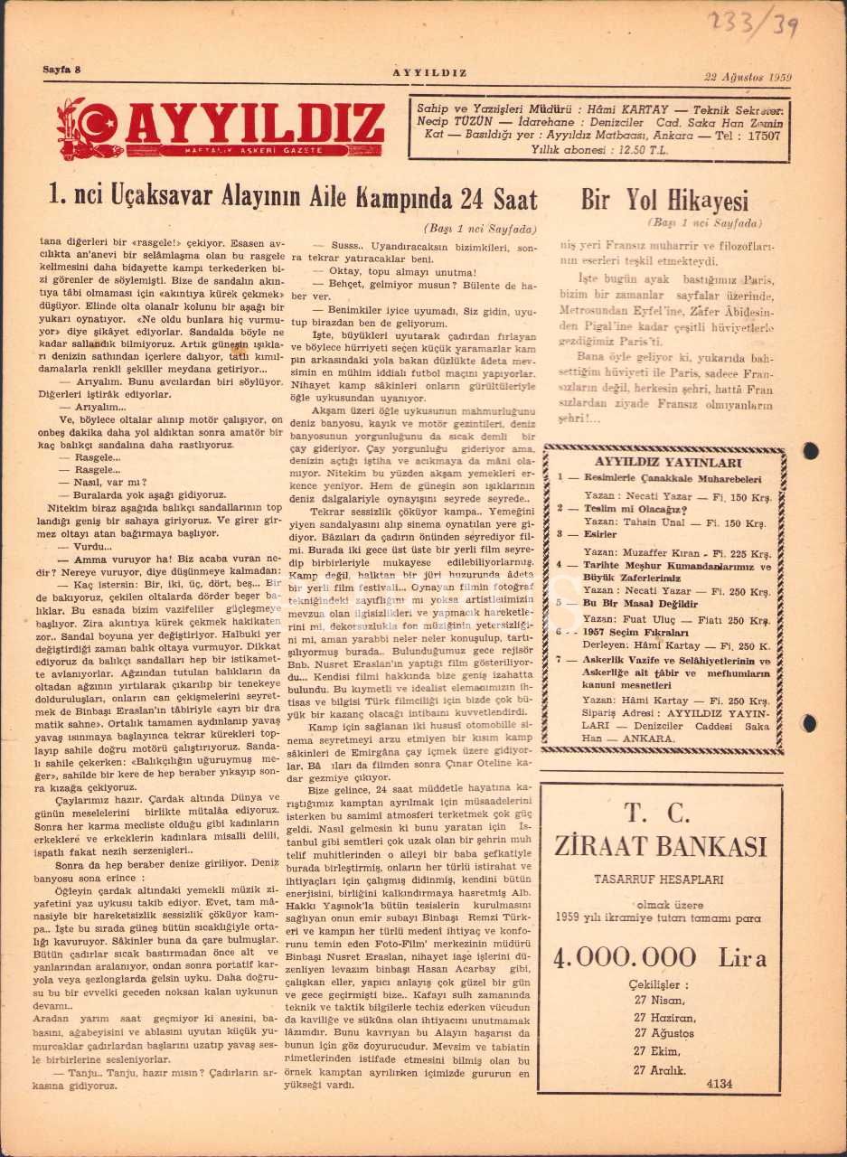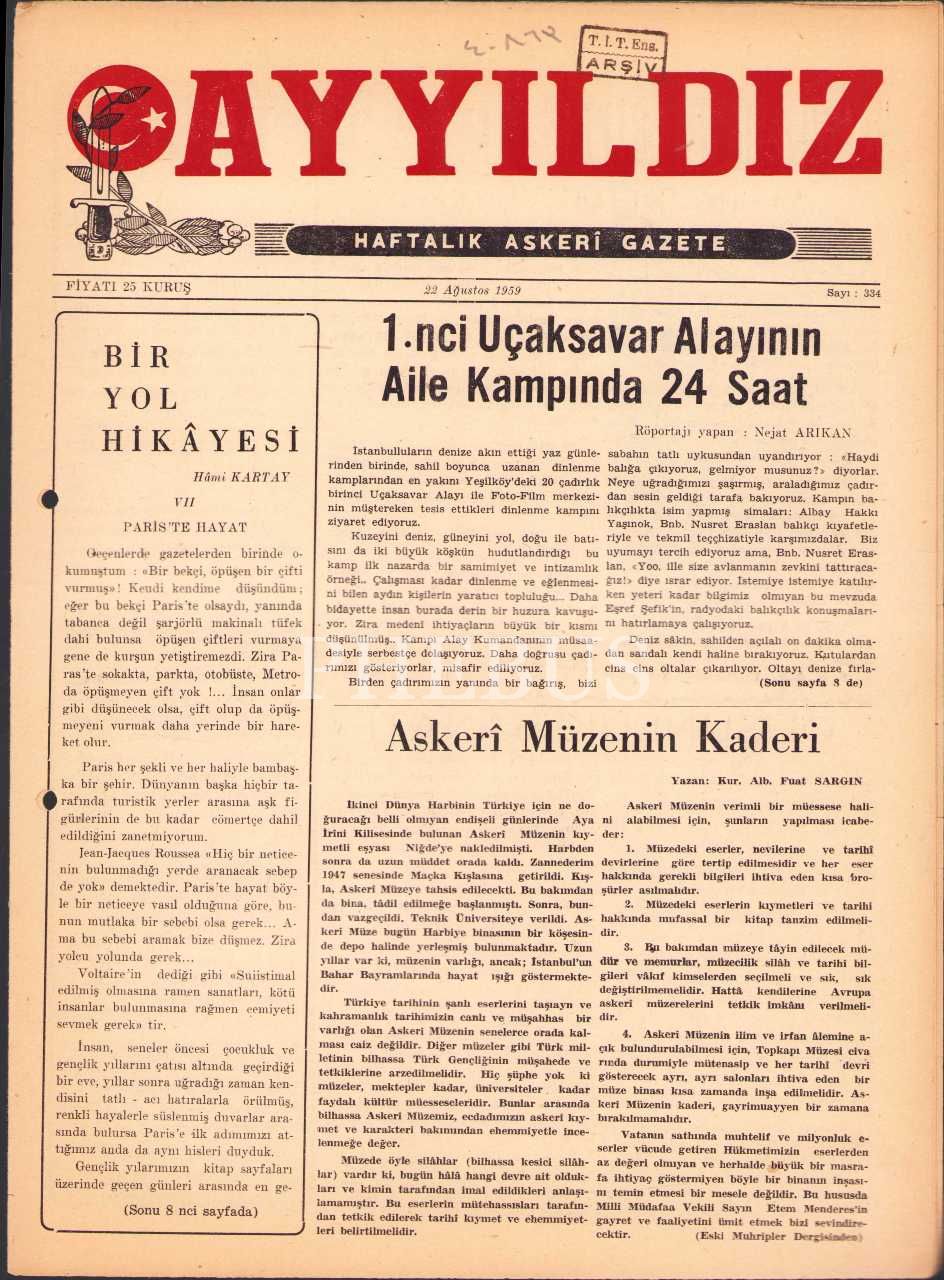 Ayyıldız askerî gazete 334. sayı, 22 Ağustos 1959, 25x34 cm, sayfaları açılmamış haliyle