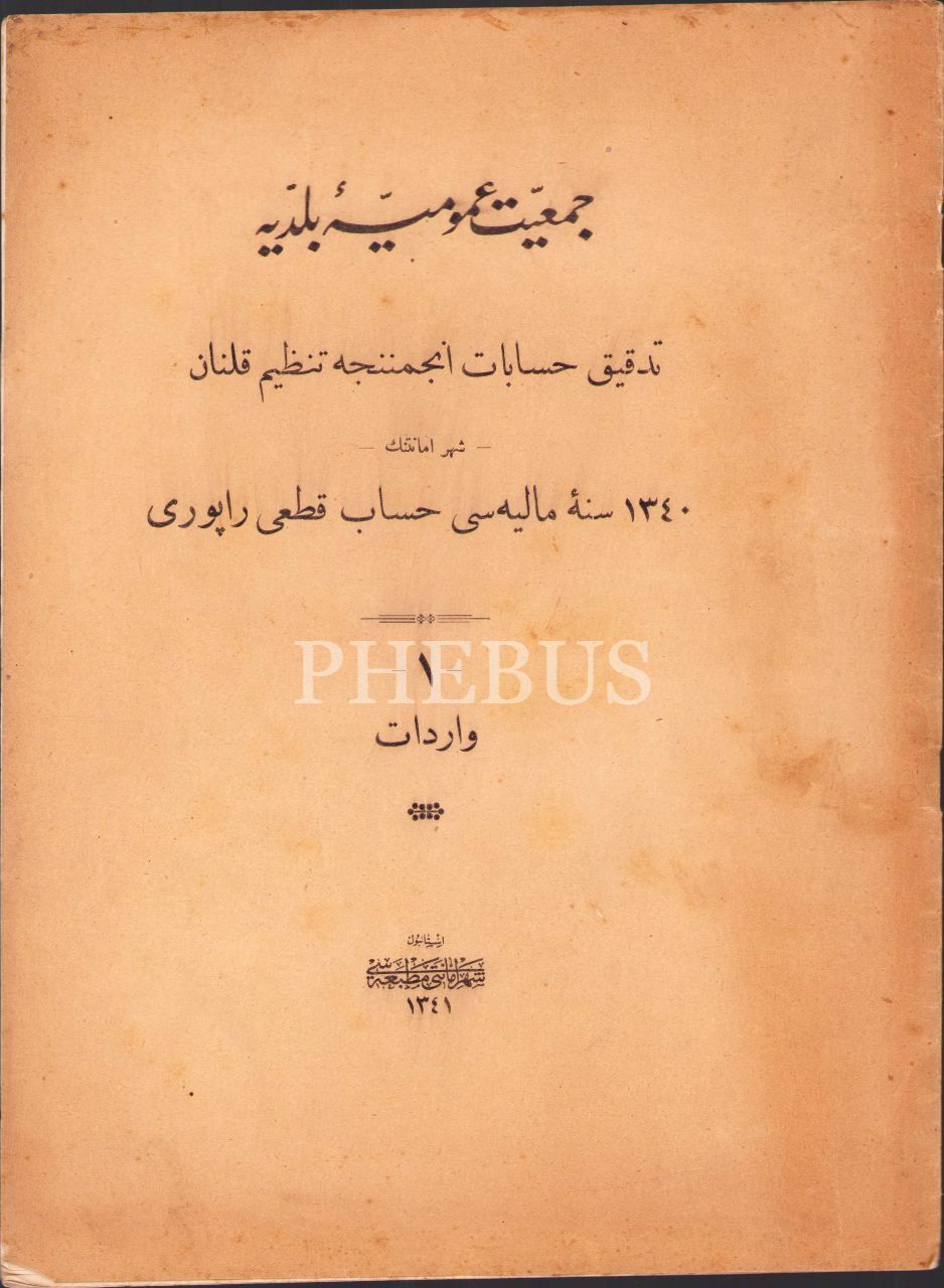 Osmanlıca Cemiyet-i Umumiye-i Belediye-Şehremanetinin 1340 Mali Senesi Hesap Raporu, Şehremaneti Matbaası, İstanbul 1341, 13 s., 23x31 cm