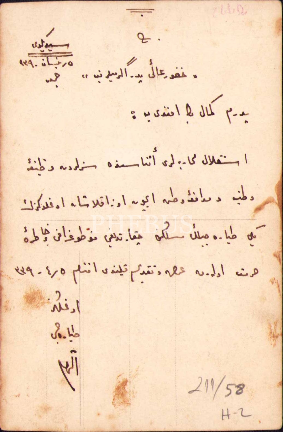 "İthaf, "Pederim Kemal Beyefendi'ye: İstiklâl muharebeleri esnasında sizlerden vazife-i vataniye ve müdafaa-i vatan için uzaklaşan oğlunuzun yeni tayyarecilik mesleğinde çıkartdığı fotoğrafı bir hatıra-i hürmet olarak arz ve takdim kılındı efendim. - Oğlunuz Tayyareci İlham?" şeklindedir.