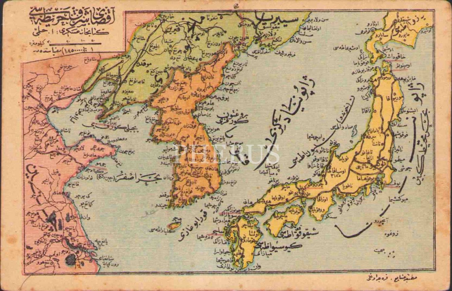 Kart formunda Osmanlıca Aksa-yı Şark [Uzak Doğu] haritası, hafif yıpranmış haliyle