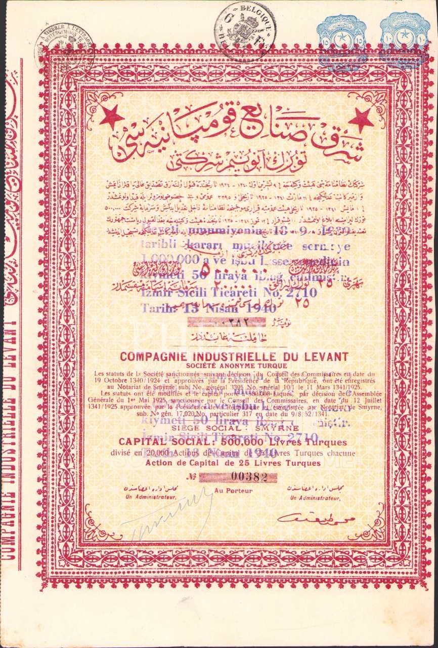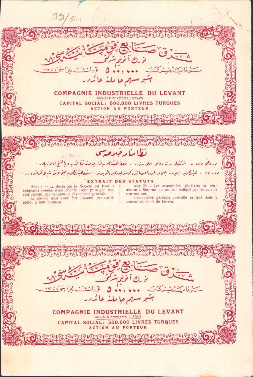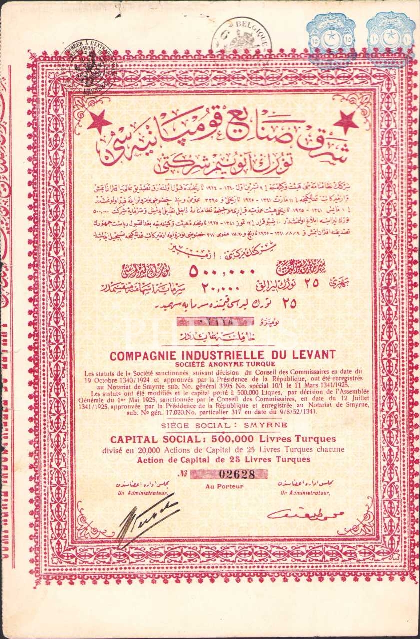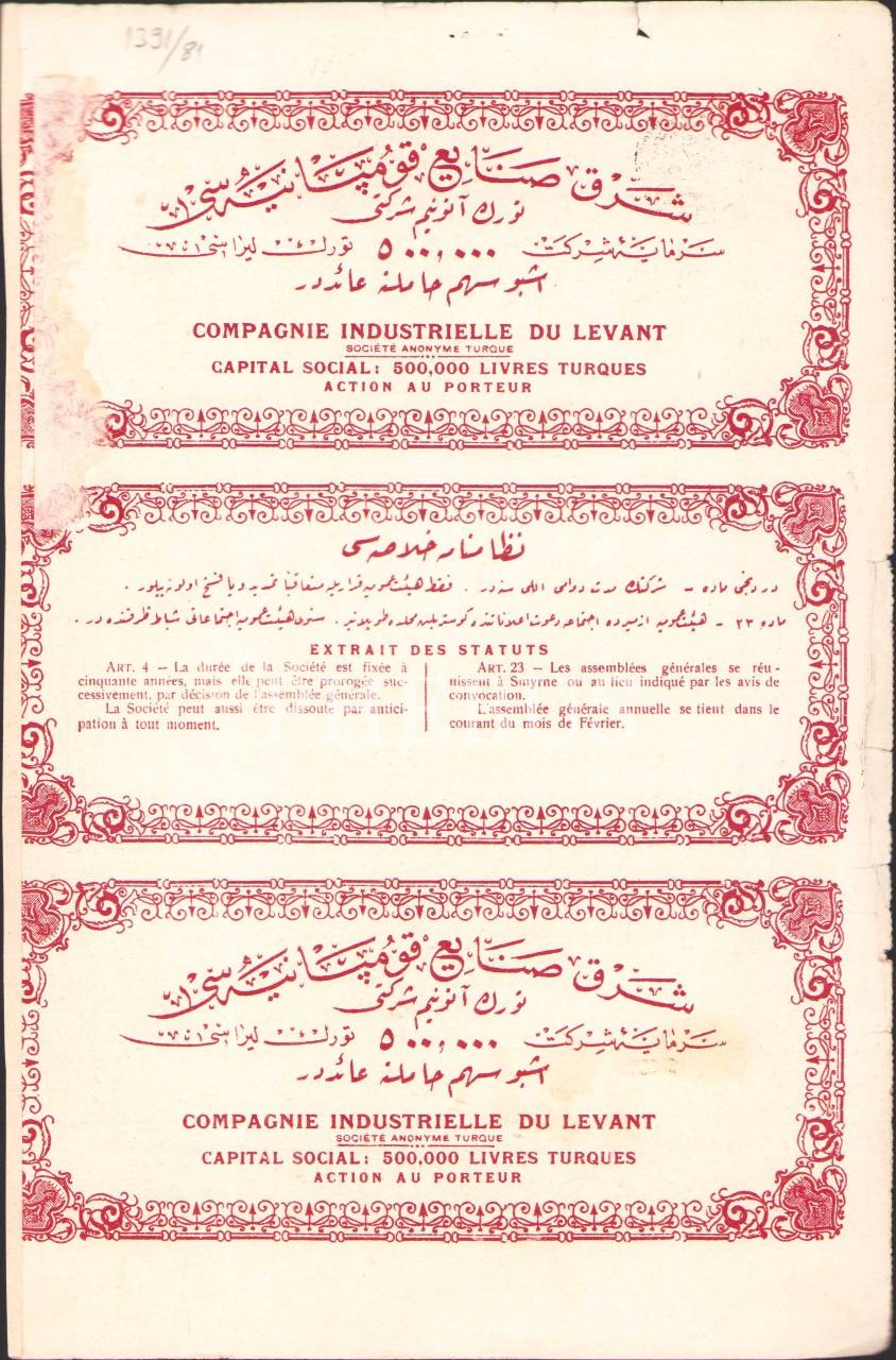 Osmanlıca Şark Sanayi Kumpanyası'na ait 2 adet hisse senedi, 20x29 cm, birinin kenarları yıpranmış haliyle