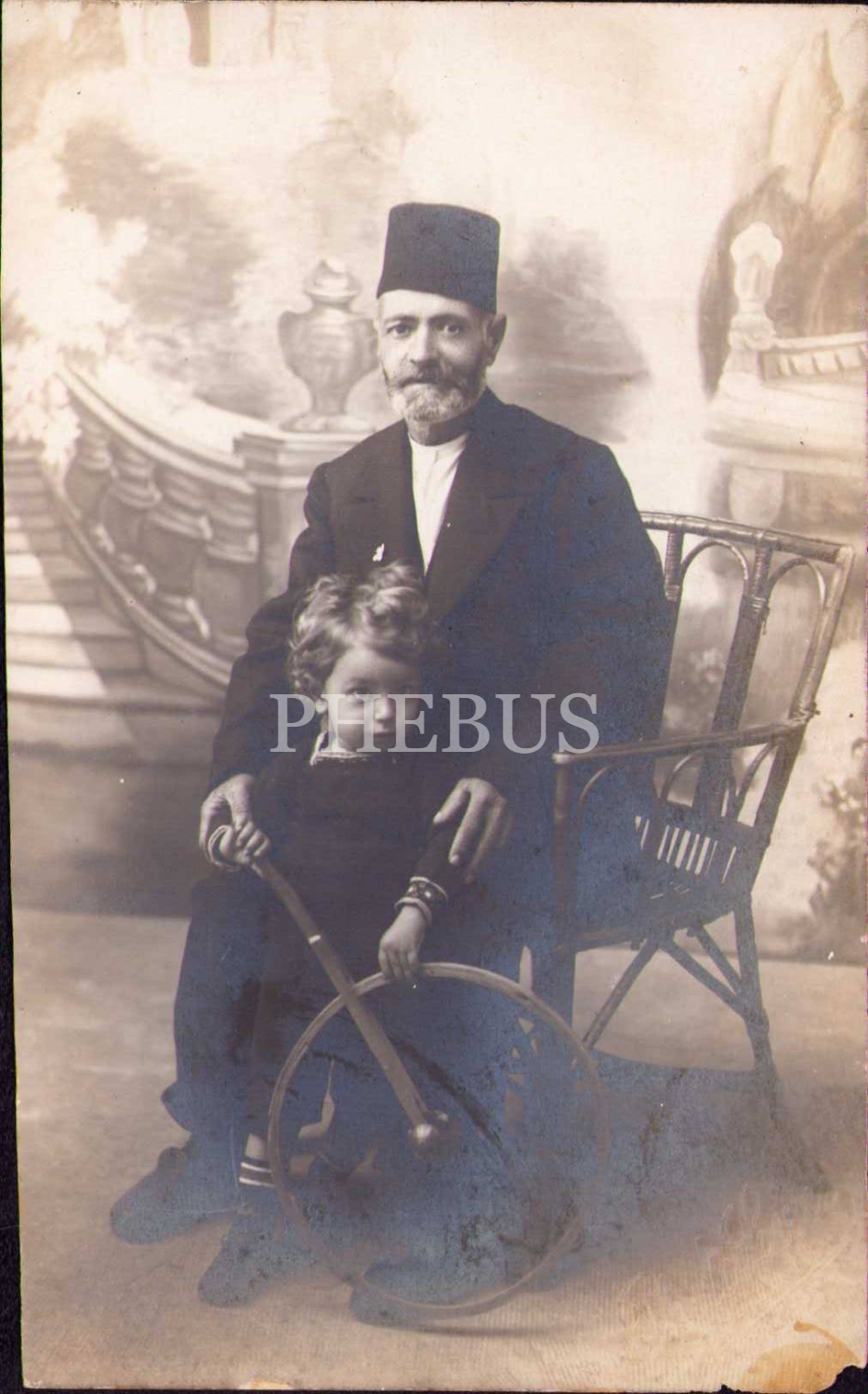Osmanlı döneminden oyuncaklı çocuk ve fesli beyefendi fotoğrafı, Photo Luxe-Kadıköy soğuk damgalı, alt köşesi yıpranmış haliyle