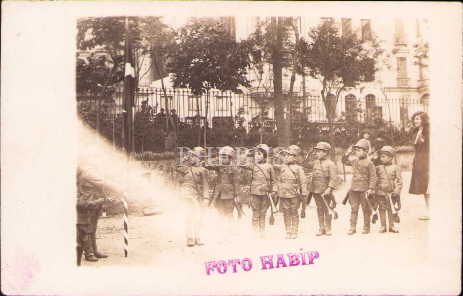 Asker üniformalarıyla selam veren çocuklar, Foto Habip damgalı, kenarları hafif soyulmuş haliyle