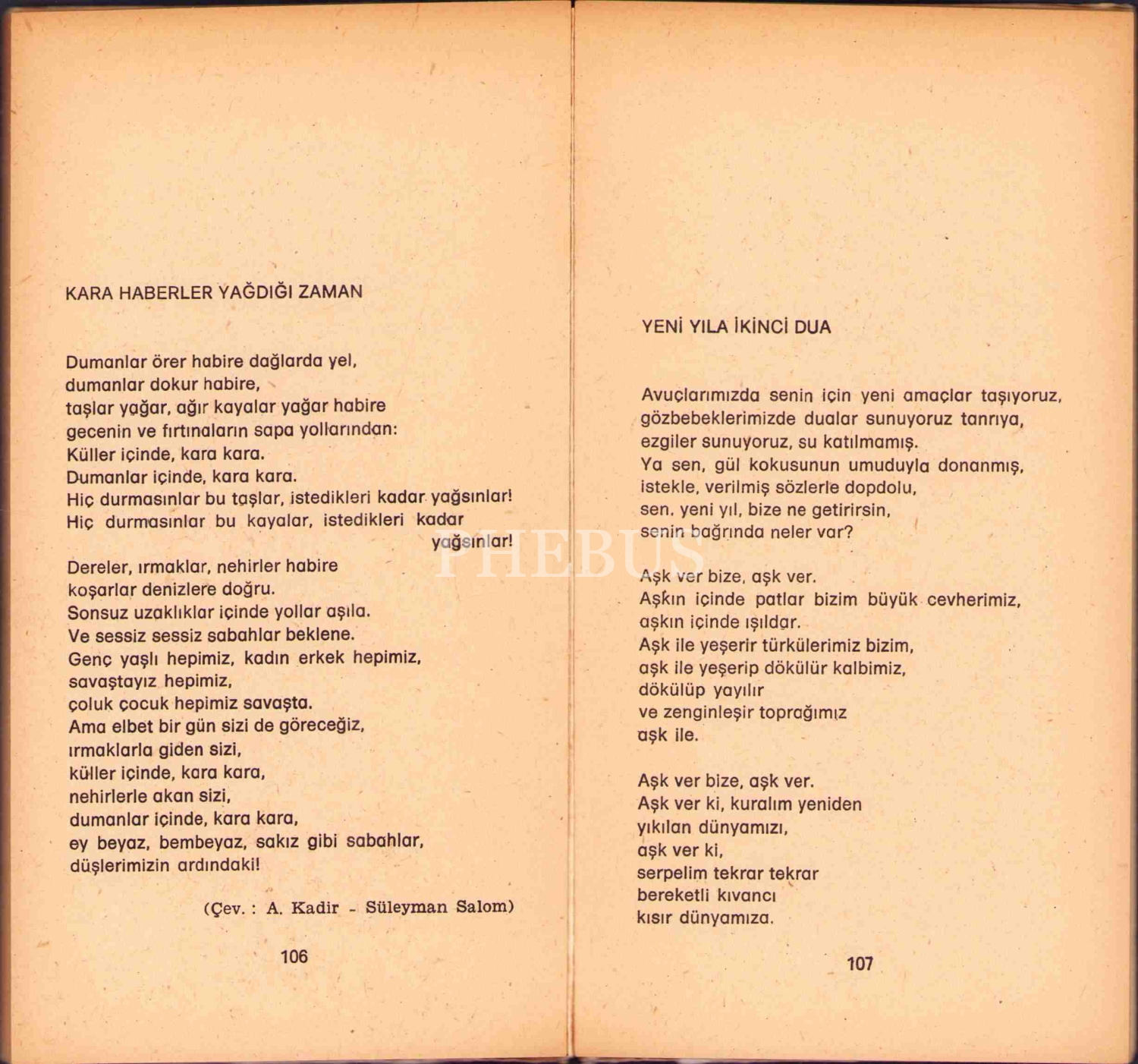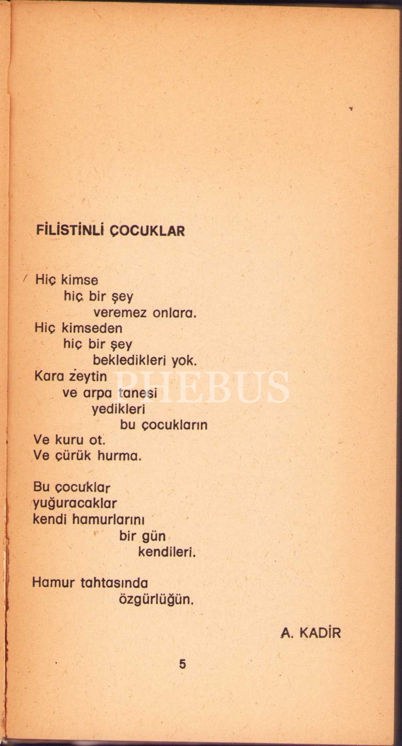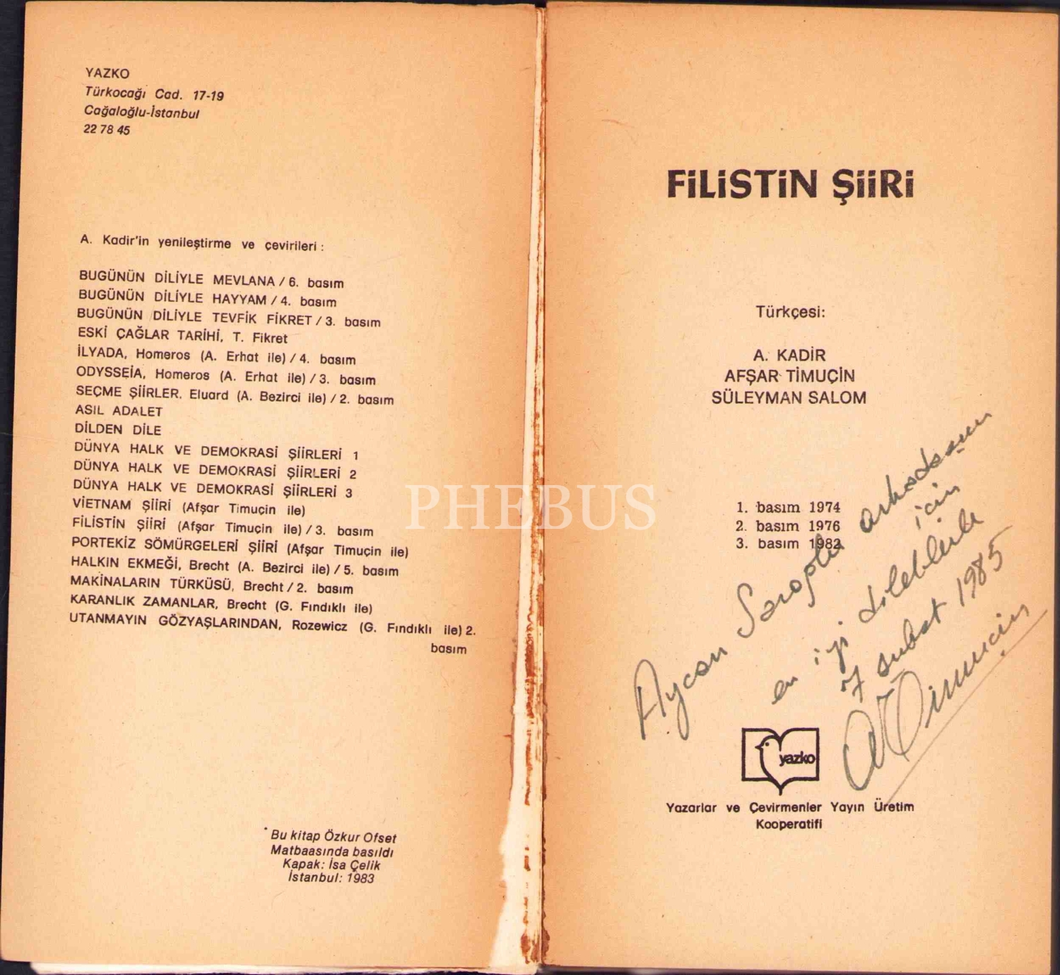 Filistin Şiiri, çev. A. Kadir-Afşar Timuçin-Süleyman Salom, Afşar Timuçin'den ithaf ve imzalı, Yazarlar ve Çevirmenler Yayın Üretim Koop., İstanbul 1983, 151 s., 10x19 cm, kapağı hafif yıpranmış haliyle