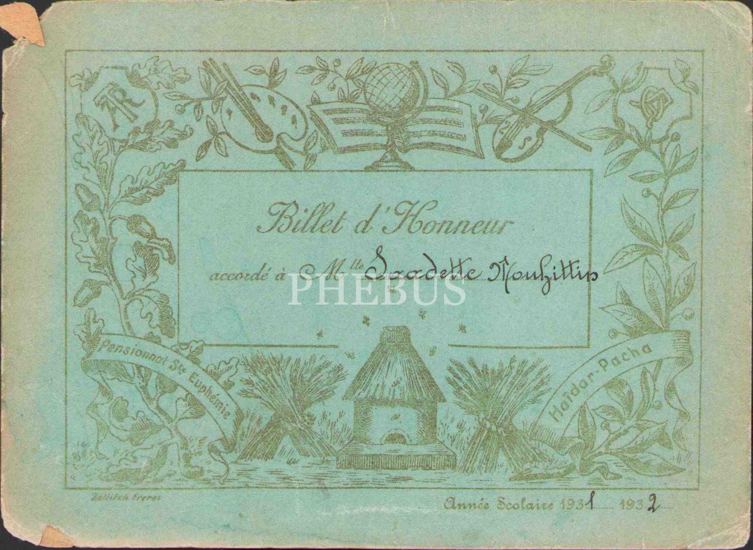 Pensionnat Ste Euphemie okulu 1931-32 ders yılına ait Fransızca onur belgesi, 12x17 cm, kenarları yıpranmış haliyle