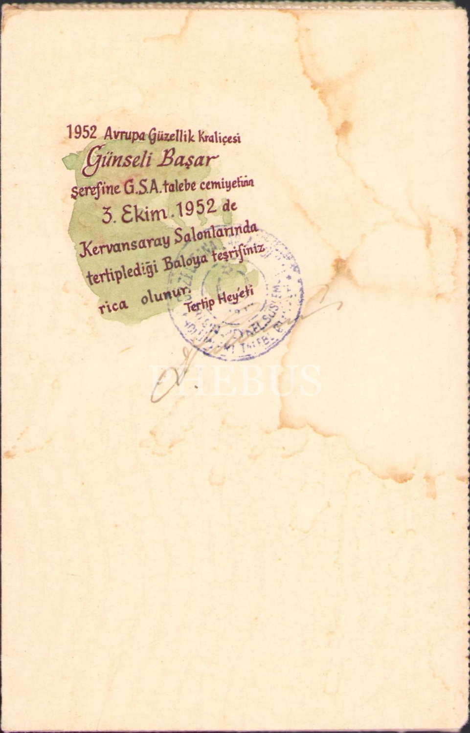 1952 Avrupa Güzellik Kraliçesi Günseli Başar şerefine düzenlenen balo davetiyesi, 1952 tarihli, 10x15 cm, su almış haliyle