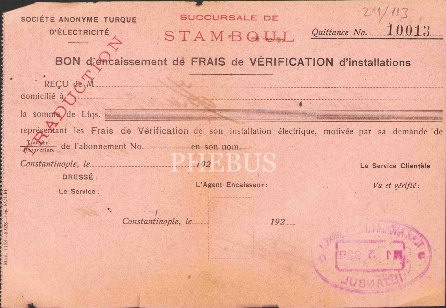 Türk Anonim Elektrik Şirketi İstanbul Şubesi antetli Osmanlıca-Fransızca makbuz, 1929 tarihli, 13x19 cm