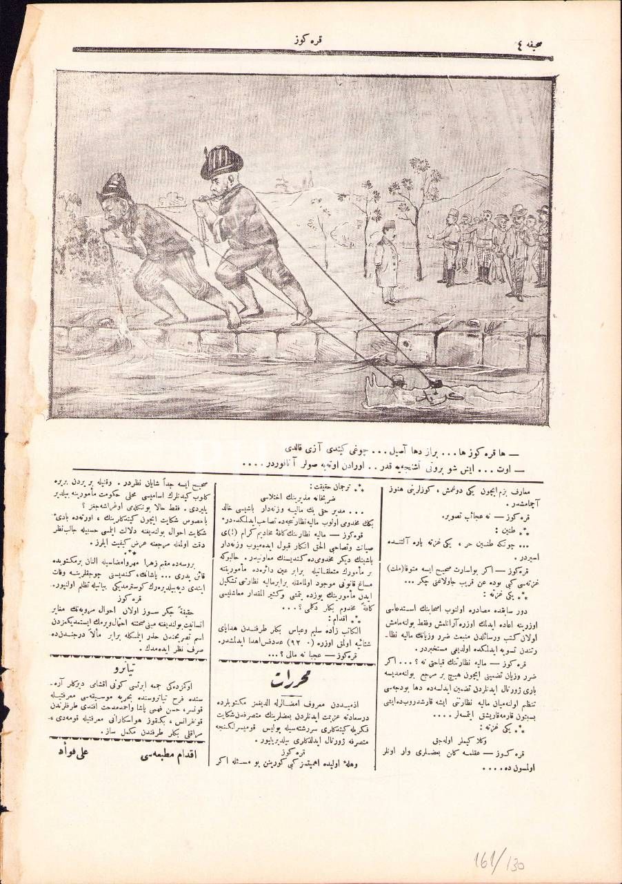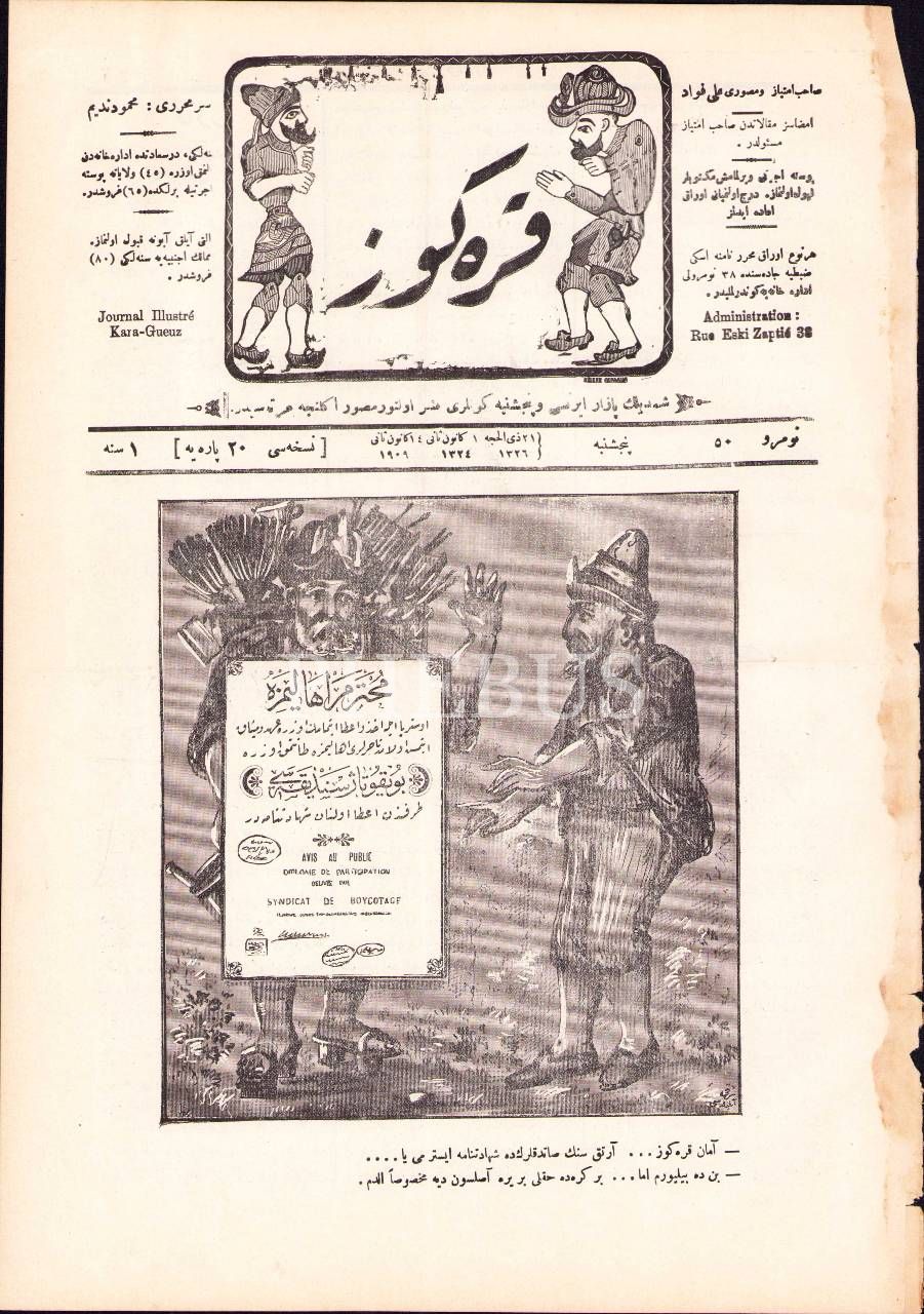 Karagöz eğlence gazetesi 50. sayı, 4 Kanunusani 1909, 4 sayfa, 27x38 cm, bir kenarı yıpranmış haliyle