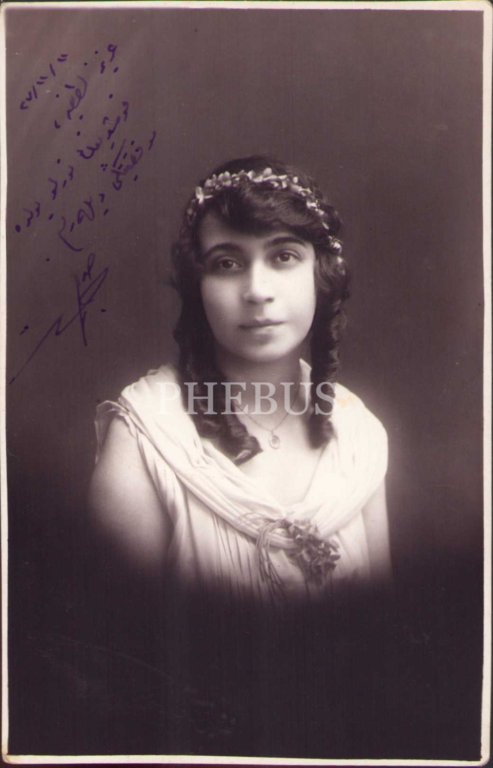 1927 tarihli genç hanımefendi fotoğrafı, Osmanlıca Nikola Andriomenos ve Mahdumu soğuk damgalı ve ithaflı, köşeleri hafif soyulmuş haliyle