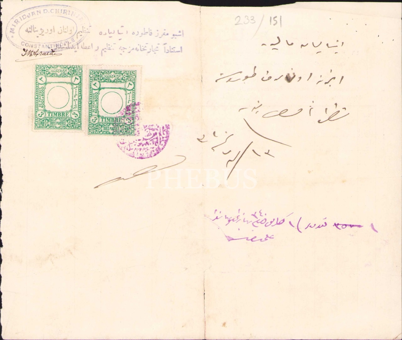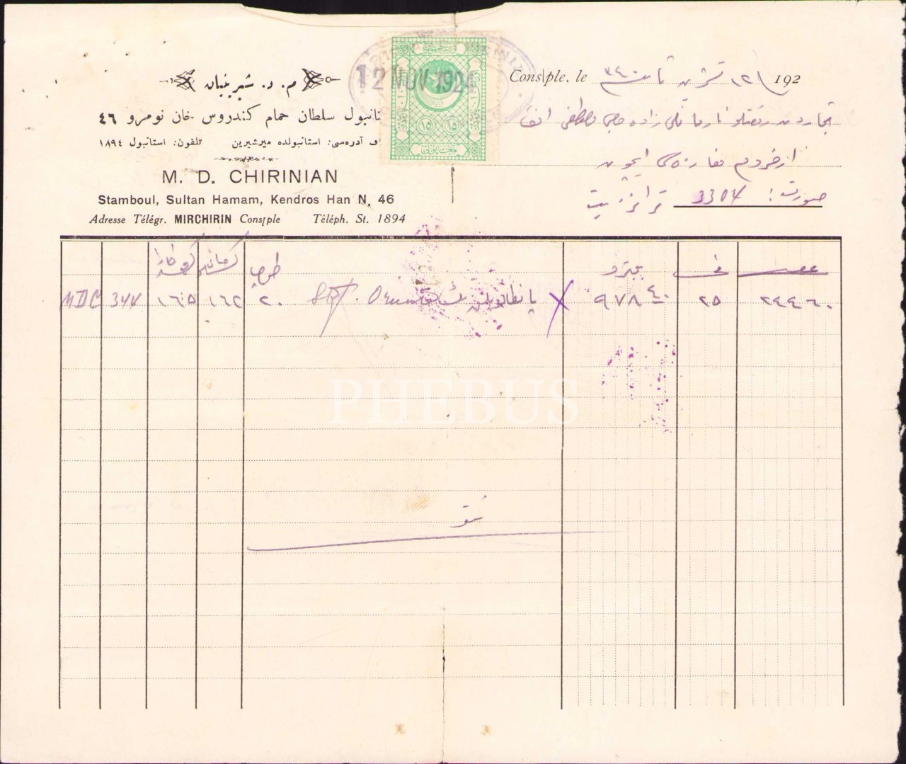Osmanlıca-Fransızca M. D. Şiriniyan atetli fatura, Constantinople 1340, 18x22 cm, alt kenarı yırtık haliyle