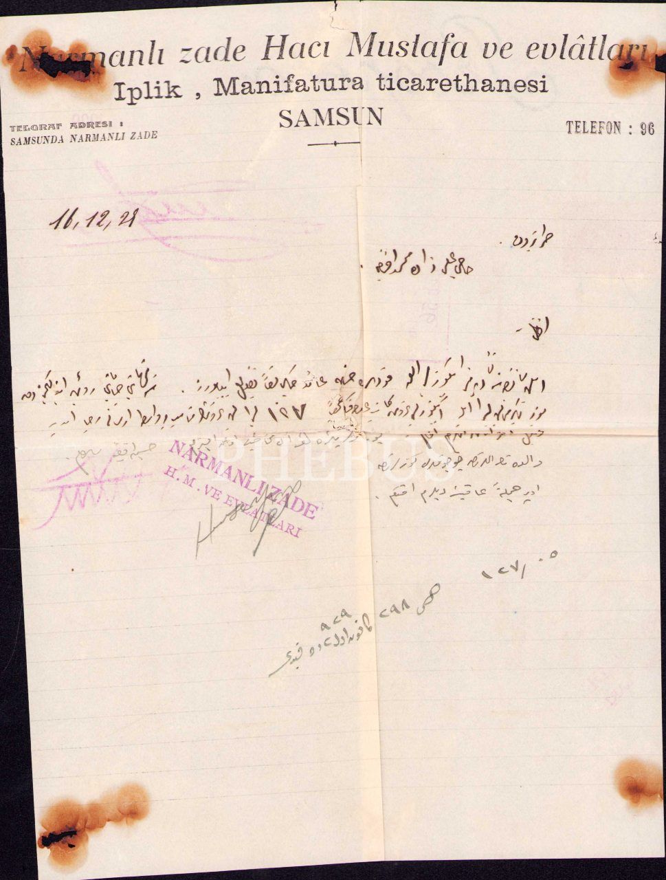 "Narmanlı zade Hacı Mustafa ve evlâtları Iplik, Manifatura ticarethanesi SAMSUN" antetli kâğıtta 1929 tarihli Osmanlıca mektup, 21x27 cm, yıpranmış haliyle