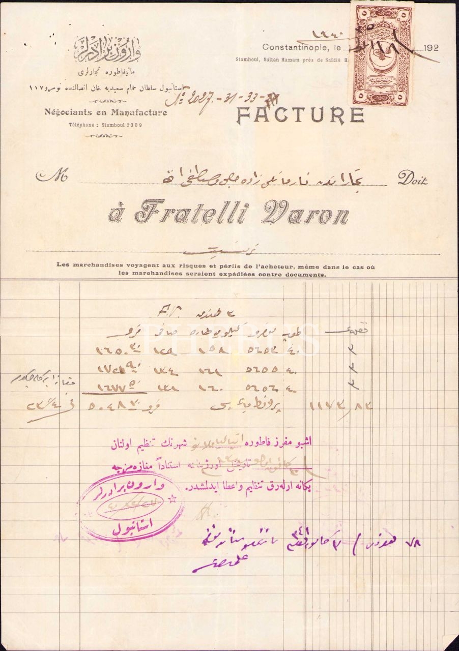 Osmanlıca-Fransızca Varon Biraderler Manifatura Tüccarları antetli ve Narmanlızade Hacı Mustafa adına kesilmiş fatura, Constantinople 1340, 20x28 cm