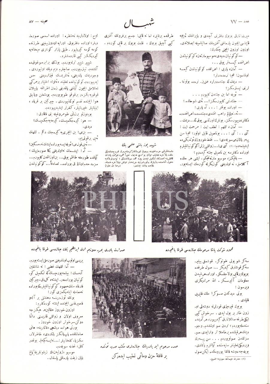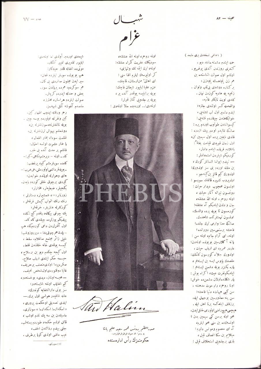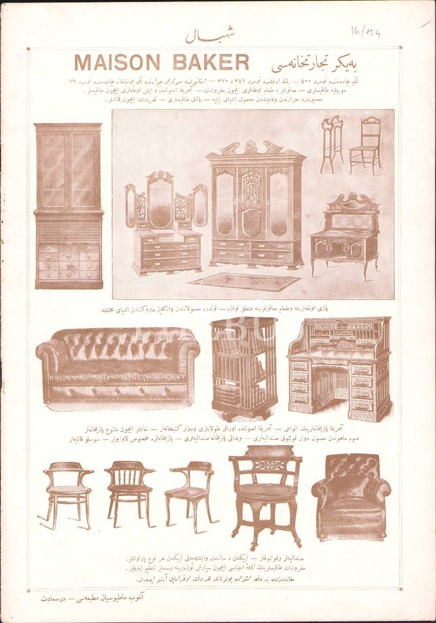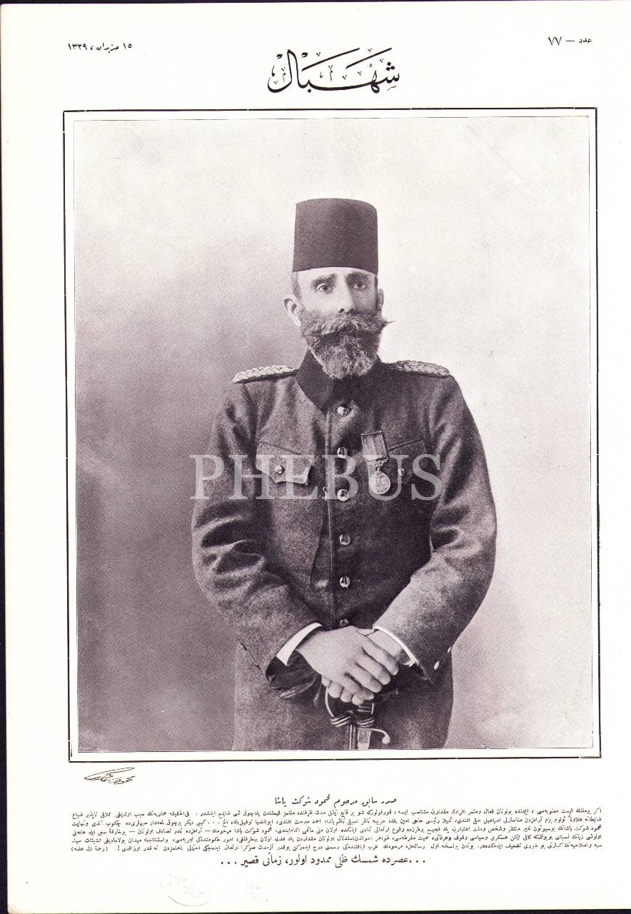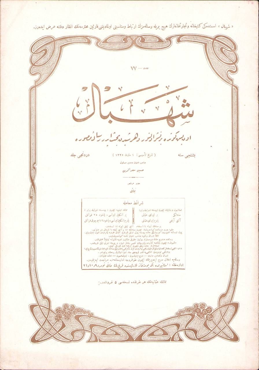 Osmanlıca Şehbal dergisi 77. sayı, 15 Haziran 1329, Mahmud Şevket Paşa'ya ait iç kapak ve Maison Baker mağazasına ait arka kapak görseliyle, 28x40 cm