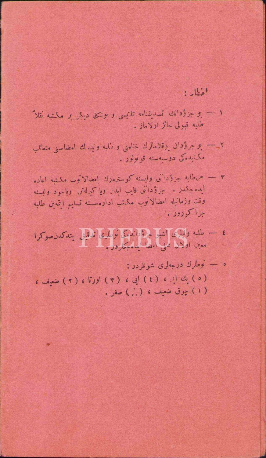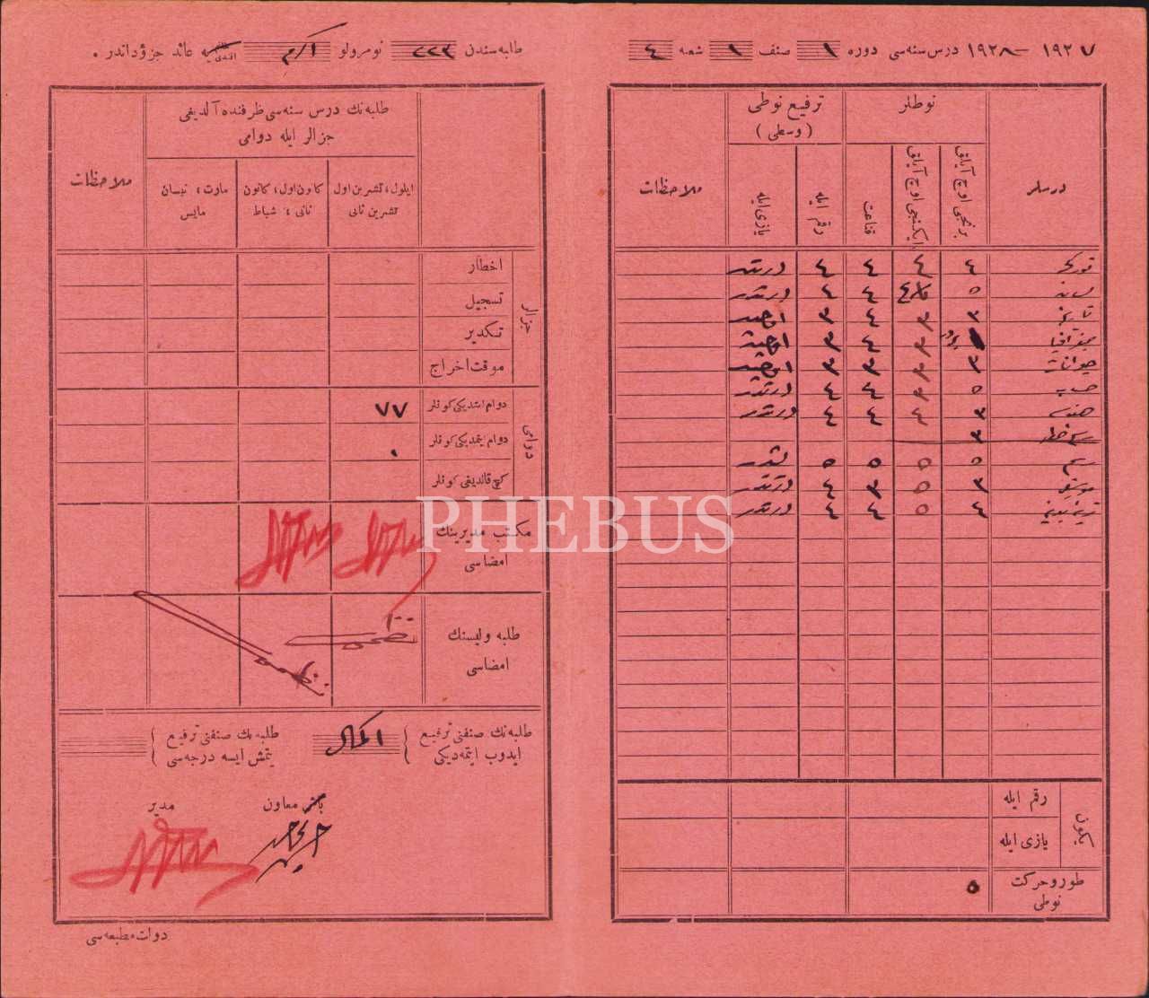 1927-28 ders yılına ait Osmanlıca öğrenci karnesi, 12x20 cm
