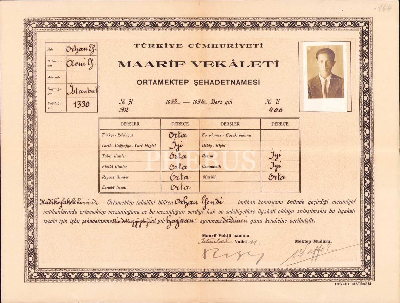 Kadıköy Erkek Lisesi'ne ait fotoğraflı ortaokul diploması, İstanbul 1934, 26x34 cm, üst kenarı yırtık haliyle