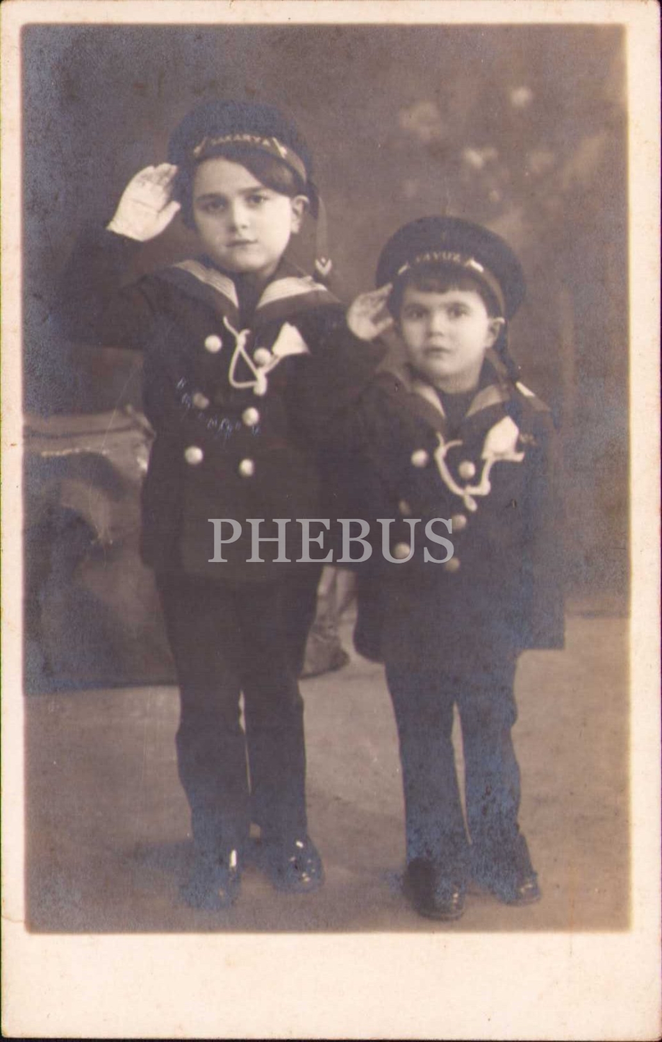 "Yavuz" ve "Sakarya" şapkaları ve bahriye üniformaları ile poz veren iki erkek çocuğu, Osmanlıca ithaflı, hafif yıpranmış haliyle