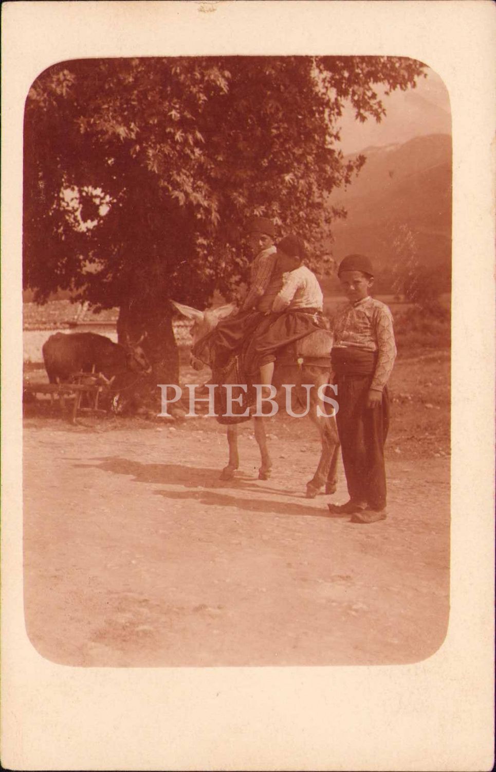 Eşek üzerinde ve yanında poz veren fesli çocuklar