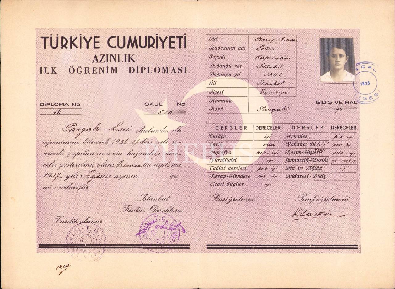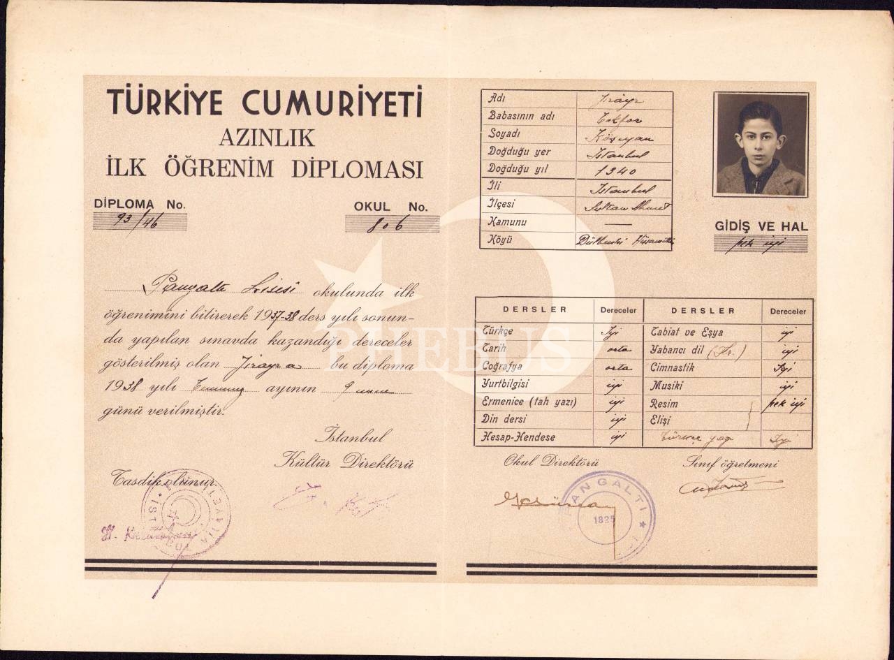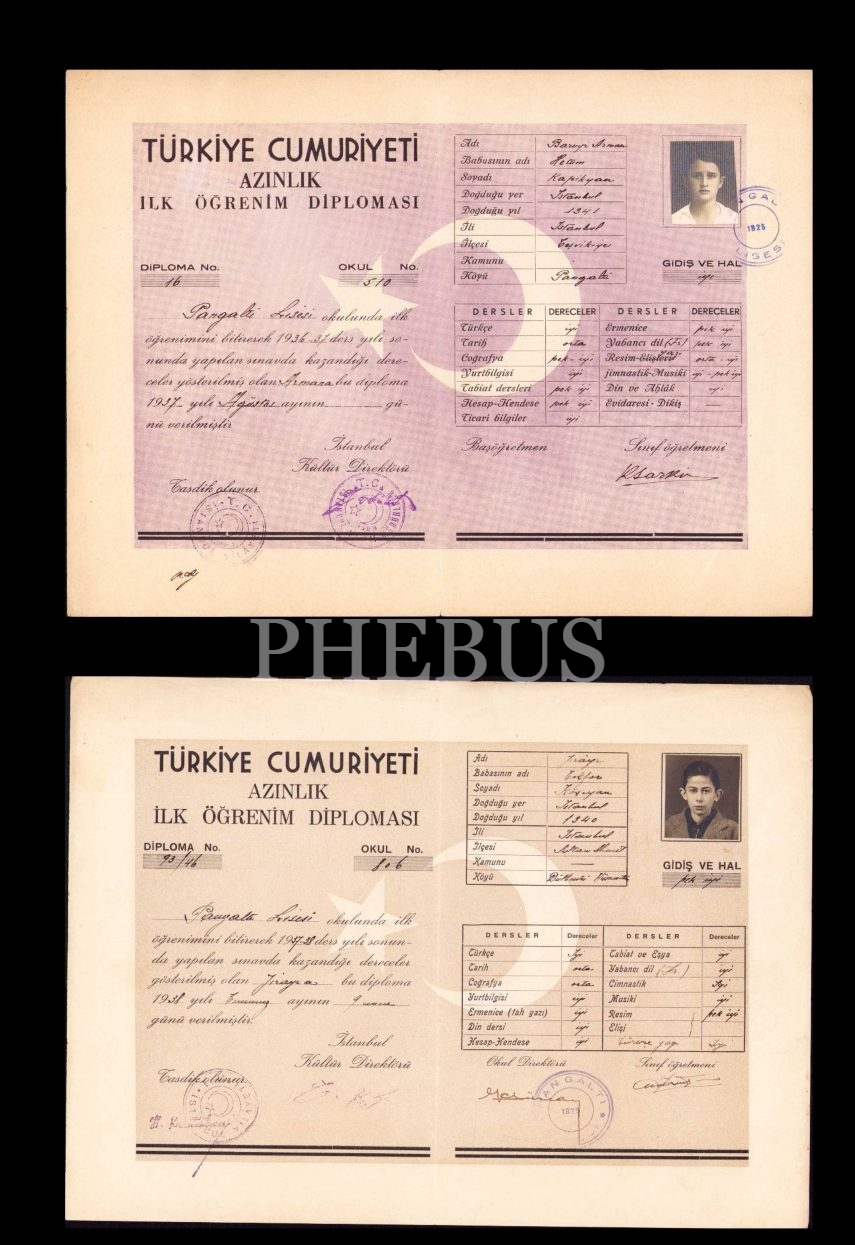 1937 ve 1938 yıllarına ait 2 adet fotoğraflı azınlık ilköğrenim diploması, Pangaltı Lisesi, 25x34 cm