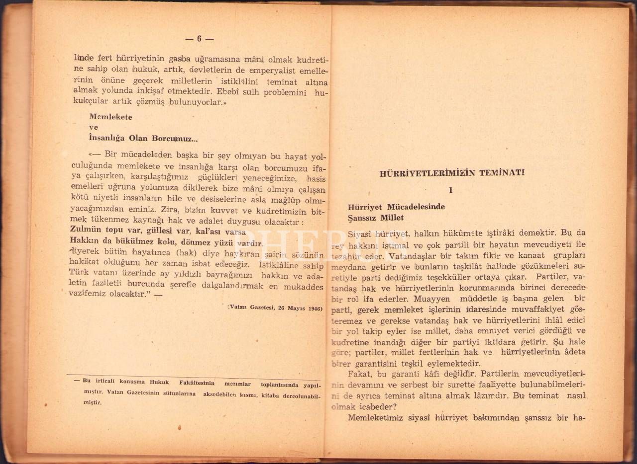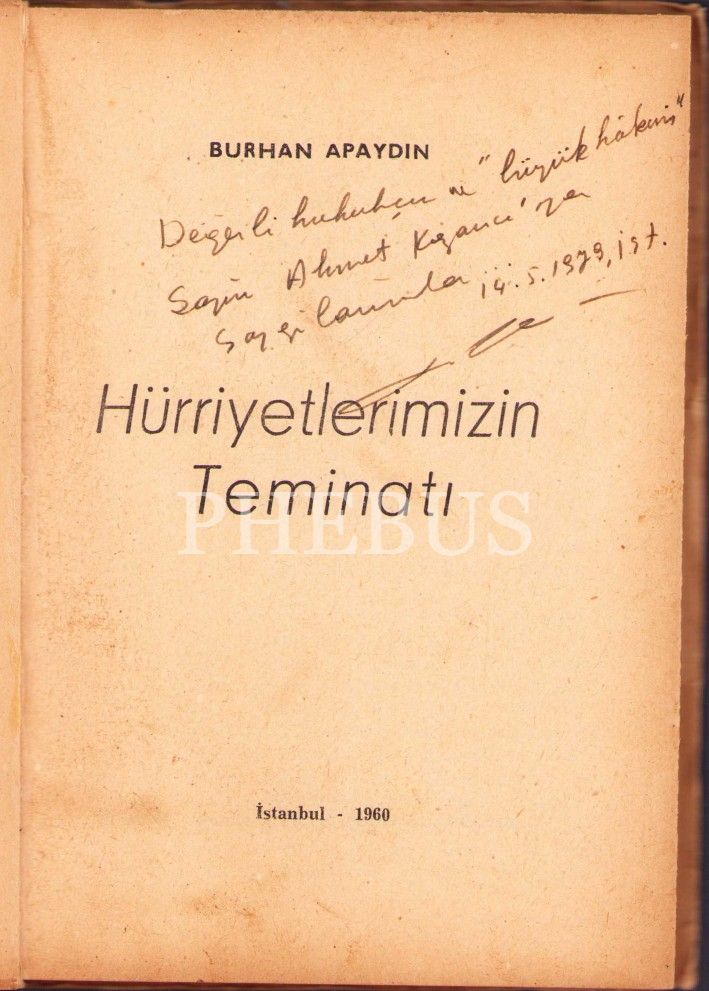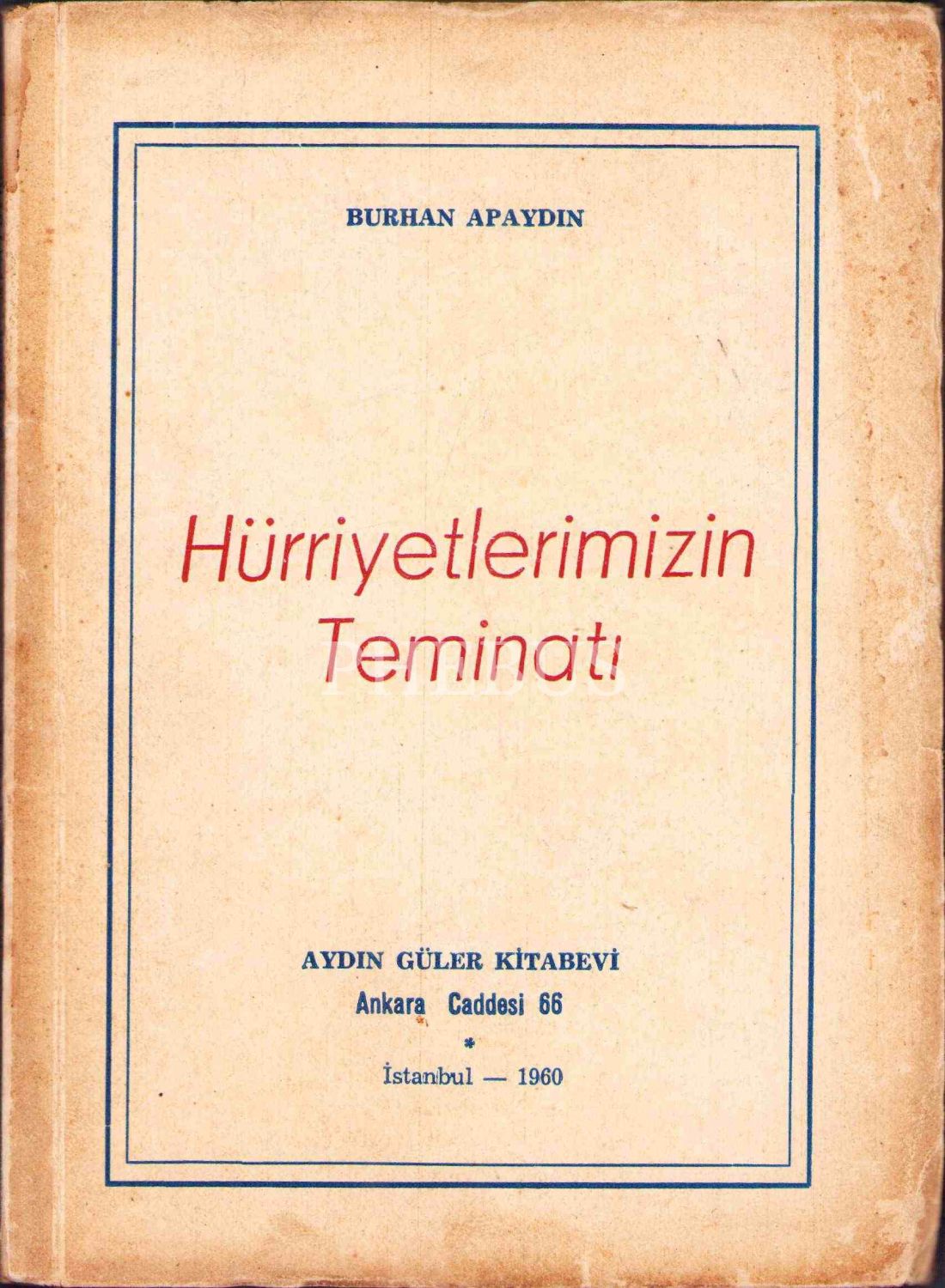 Hürriyetlerimizin Teminatı, Burhan Apaydın, ithaf ve imzalı, Aydın Güler Kitabevi, İstanbul 1960, 14x20 cm, kapağı su almış ve hafif yıpranmış haliyle